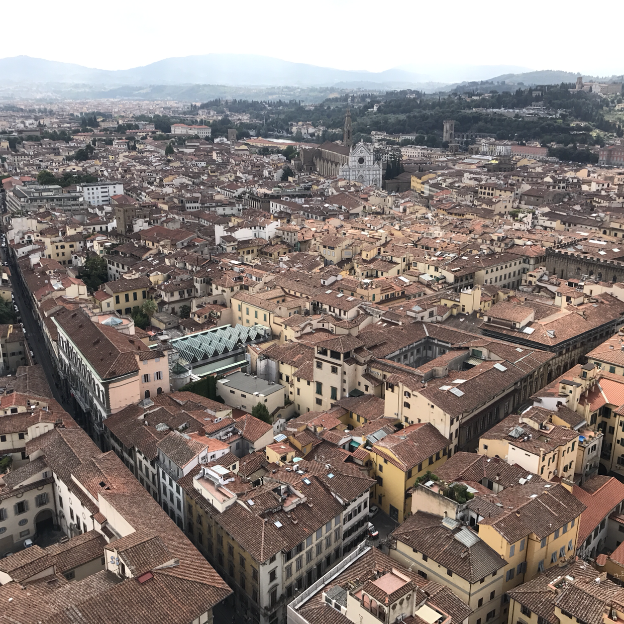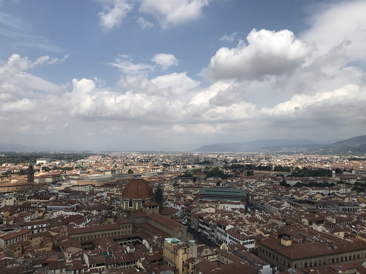 저 멀리 보이는 너무 높지 않은 산과, 막 흐림을 걷어낸 쪽빛 하늘과, 둥실둥실 솜사탕을 잘 떼어다 예쁘게 붙여놓은 듯한 구름과, 땅의 나지막하고 붉은 지붕들이 이루는 조화는 로마와는 또 다른 매력을 발산하고 있었다. 그 가운데 조토의 종탑이 서서 중심을 잡아 주고 있으니, 부담스럽게 화려하지도, 너무 심심하지도 않은, 밸런스가 환상적인 풍경. 로마를 보고서는 헤라나 모니카 벨루치가 떠올랐다면, 피렌체에서는 아테나와 장쯔이가 떠올랐다고나 할까. 참 이상하게도 이탈리아의 여러 도시들을 의인화시키면 자꾸 여자들만 떠오른다.