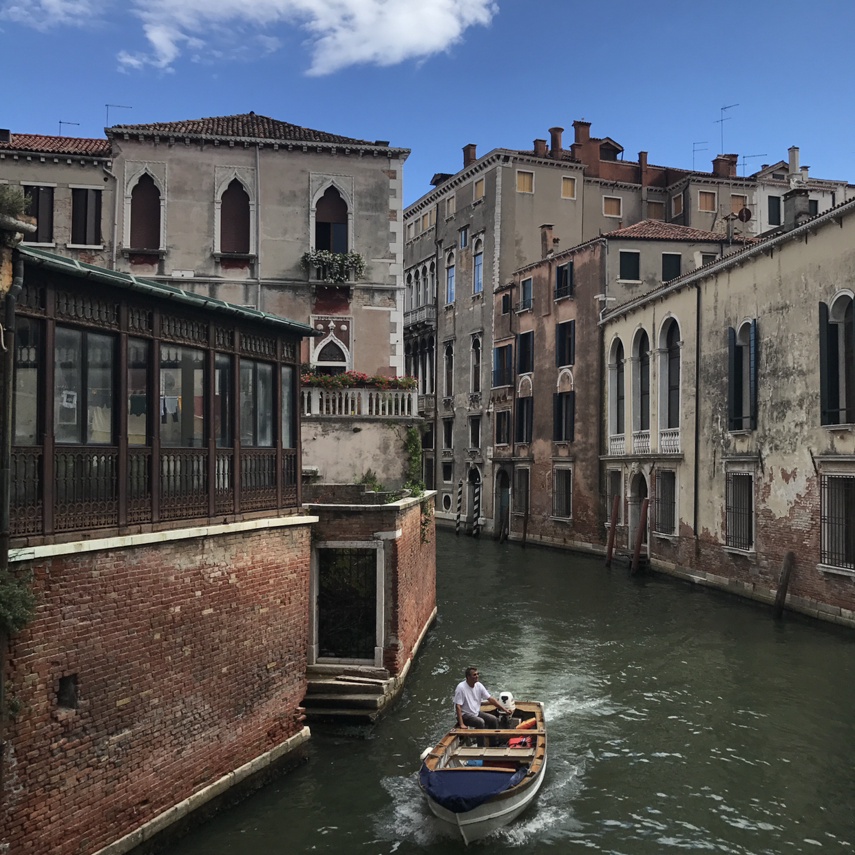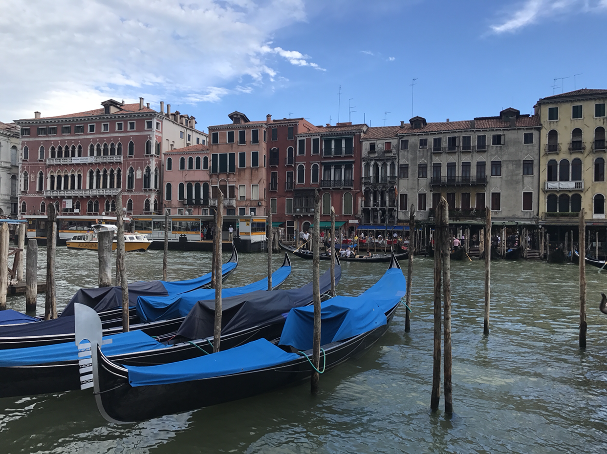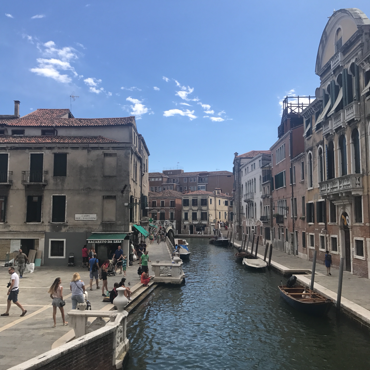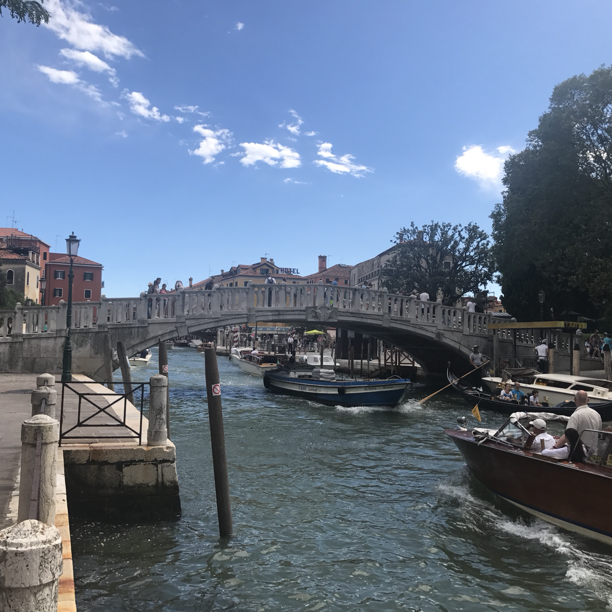 좋아하는 음악을 들으며 발걸음을 옮긴다. 로마에서는 내가 마치 세상의 중심에 있는 듯 위풍당당한 노래들에 끌렸었지만, 이 곳에 오니 평소에는 듣지도 않는 사랑 노래들이 너무 좋게 들린다. 사람이 너무 많지 않을까 우려했지만 로마에서 적응을 해서 그런지 생각보다 괜찮았고, 바람이 불어와서인지 로마보다는 더 걷기 좋게, 하지만 여름이라는 계절이 아쉽지 않을 정도, 딱 그 정도로 더웠다. 초입에서부터 길가의 노점에는 조그만 가면이며, 예쁜 레이스 장식이며 기념품을 파는 곳들이 시선을 사로잡았고, 다리 뒤에 올라서니 여행자들의 핫플레이스 산타루치아 역이 보였다. 다리 아래로 눈부신 햇살을 그래도 담아 반짝거리는 물길이 있고, 그 위를 곤돌라며 수상택시며 바포레토들이 수놓고 있는 그 모습에 의식이 잠시 교체되는 느낌이었다.
