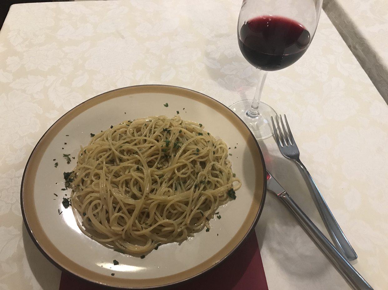 빗줄기가 후드득후드득, 어라, 근데 빗줄기가 왜 이렇게 굵지? 3분도 채 안 되는 사이, 태풍급의 빗줄기가 쏟아져 내린다. 평소 같았으면 운동화 다 젖네 하면서 투덜 되었을 이 상황에도 나는 베네치아의 마법에 걸려 허허, 역시 베네치아야 비도 화끈하게 쏟아붓는구먼! 하고 감탄하면서 버스 정류장 쪽 방향으로 걸었다. 비가 좀처럼 그칠 기미가 보이지 않고 운동화는 이미 다 젖어서 축축해졌고, 나의 연약한 3단 우산으로는 더 이상 버티기 힘들겠다 싶을 무렵, 앞을 보니 피자를 파는 가게가 있었다. 저기로 피신해서 저녁이나 먹어야겠다 하고 후다닥 뛰어가니 야외 테이블을 정리하고 있던 웨이터가 물에 젖은 생쥐꼴을 한 나를 보고 어휴, 베이비, 이 빗속을 어떻게 또 걸어왔어, 춥지 하며 우쭈쭈 안아준다. 나는 베이비가 아니지만, (이탈리아 사람들은 동양인을 보면 일단 어리게 보는 경향이 있다) 일단 배도 고프고 비를 맞아 추웠기에 안에 들어가 자리를 잡았다. 어디 보자, 메뉴판을 보니 오늘은 오일 파스타가 좋겠군 하고 파스타와 레드와인 한 잔을 주문했다.