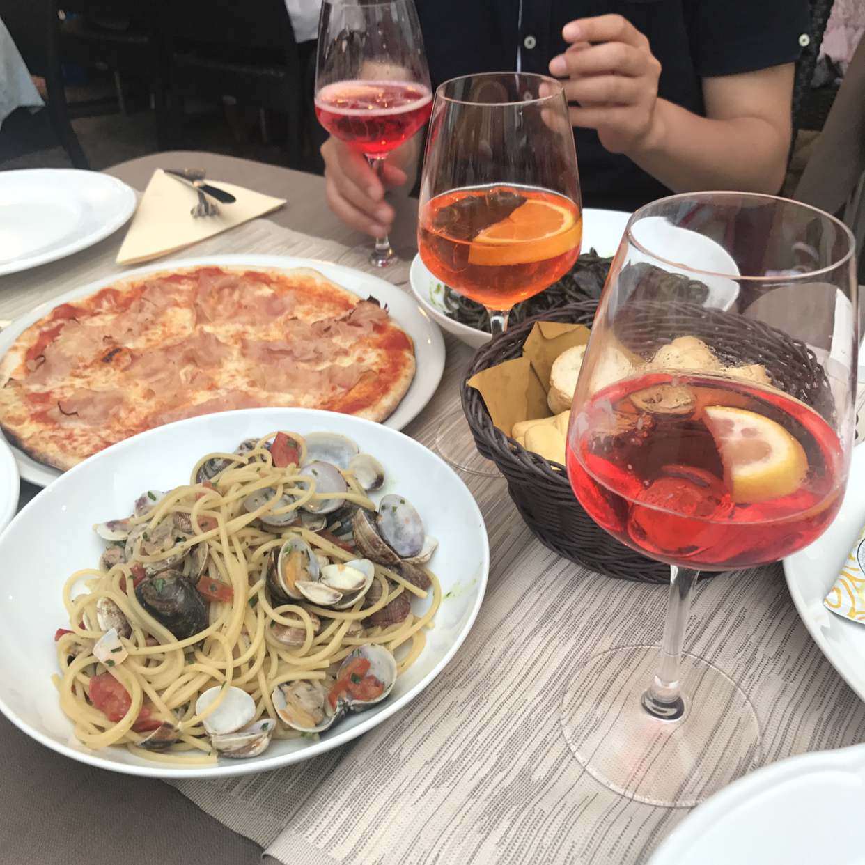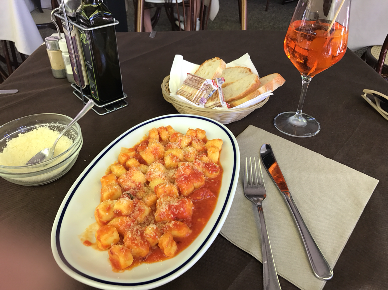 여기선 뭘 먹어볼까 하고 큰길로 나오니 야외에 테이블이 세팅되어 있는 예쁜 식당이 눈에 띈다. 큰 고민 없이 들어가서, 메뉴판을 보고 오늘은 목요일이니 뇨끼를 먹어야지 하고 뇨끼와 스프리츠를 시켰다. 전통적으로 이탈리아에는 로마 가톨릭 신자가 대부분이라 금요일에는 금식을 하거나 고기를 먹지 않는 풍습이 있었다고 하는데, 그래서인지 배가 쉽게 부르고 든든한 뇨끼를 금식하기 전 목요일에 많이 먹었다고 한다. 뇨끼를 특정 요일에 먹는 전통은 지역별로 차이가 있어 로마의 경우에는 목요일에 먹었고, 베로나 지역은 금요일에, 캄파냐 지역은 일요일에 먹었다나. 아무튼 뇨끼는 맛있었고, 나는 야외 테이블에서 멋진 전망을 보며 맛있는 식사를 했다. 리도섬은 특히나 휴가를 와서 지내면 참 좋겠다 싶은 곳이었다. 쾌적하고, 로맨틱하고, 해변이 가깝고.