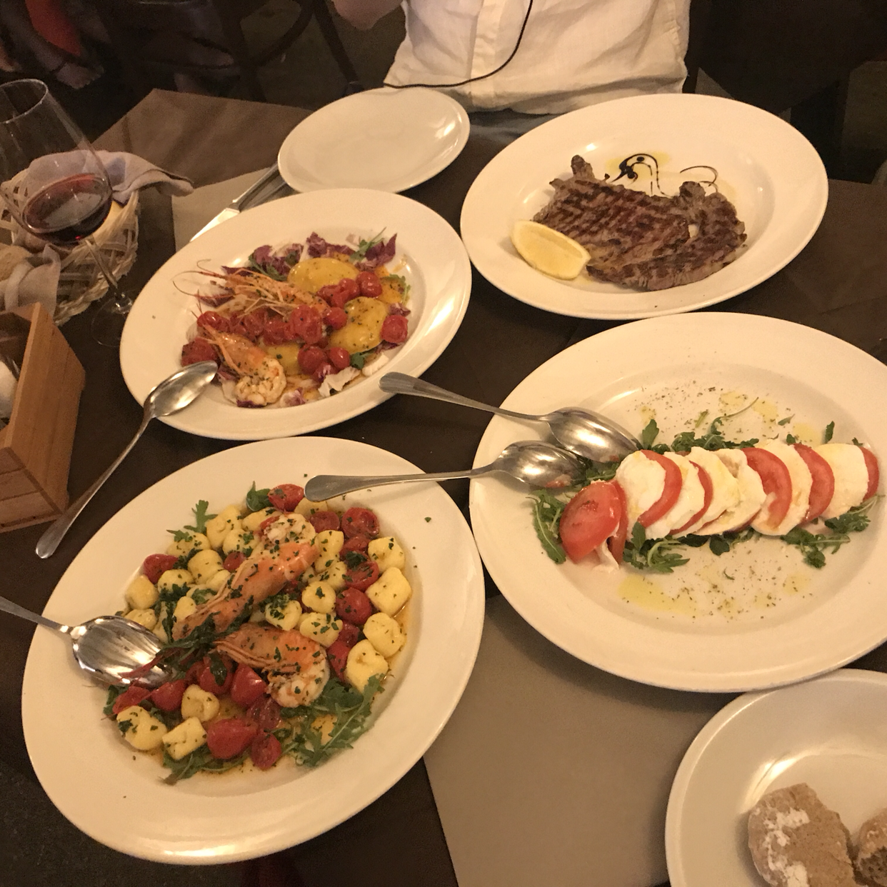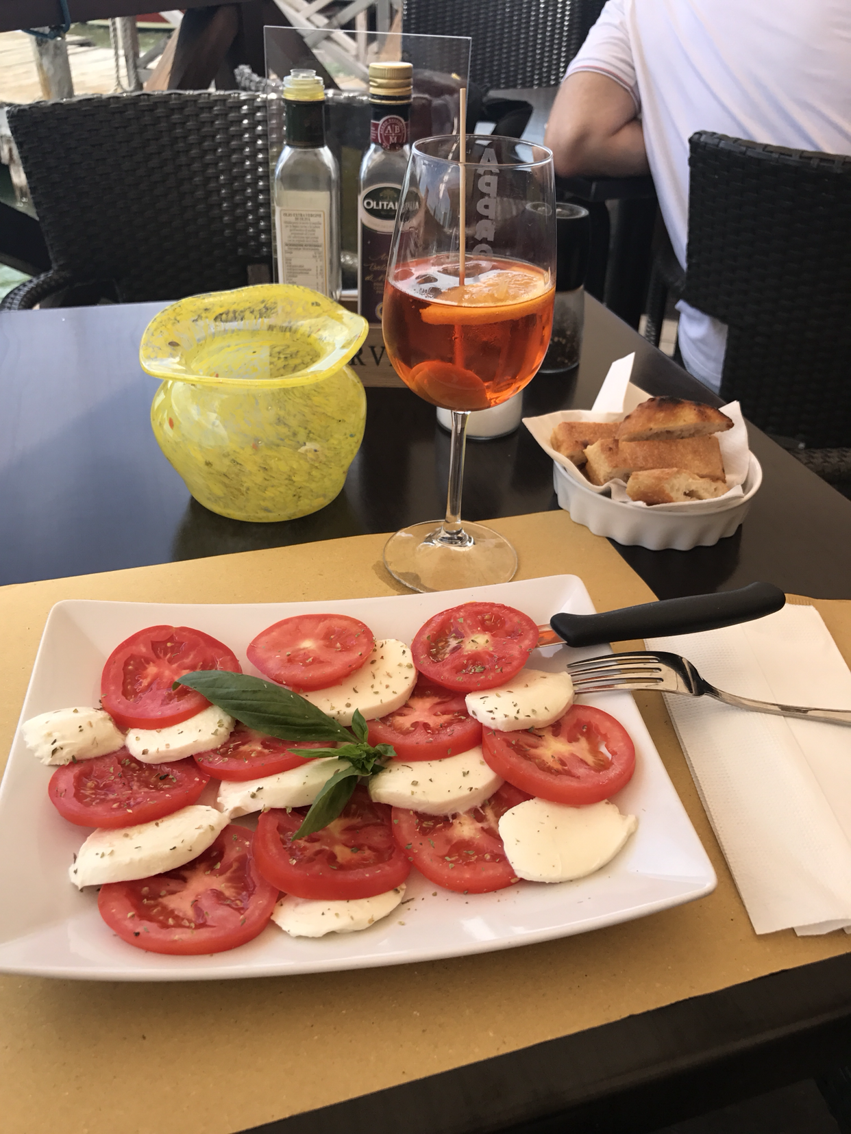 선착장 근처 눈에 띄는 식당에 들어가 바다가 보이는 야외 테이블에 자리를 잡았다. 친절한 웨이터가 가져다준 메뉴판을 보니, 오늘은 카프레제 샐러드가 끌린다. 신선한 토마토와 쫄깃한 모차렐라 치즈의 조합. 오늘 분위기에 맞는 메뉴는 딱 이거군! 하며 카프레제 샐러드와 스프릿츠를 한 잔 시켰다.