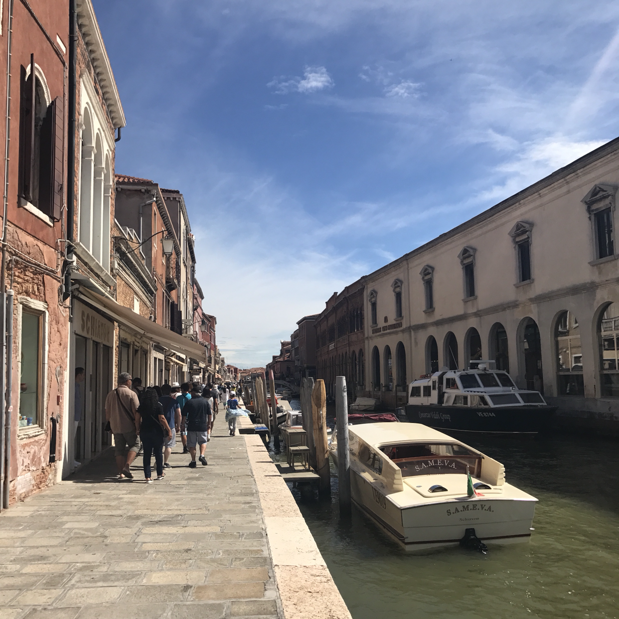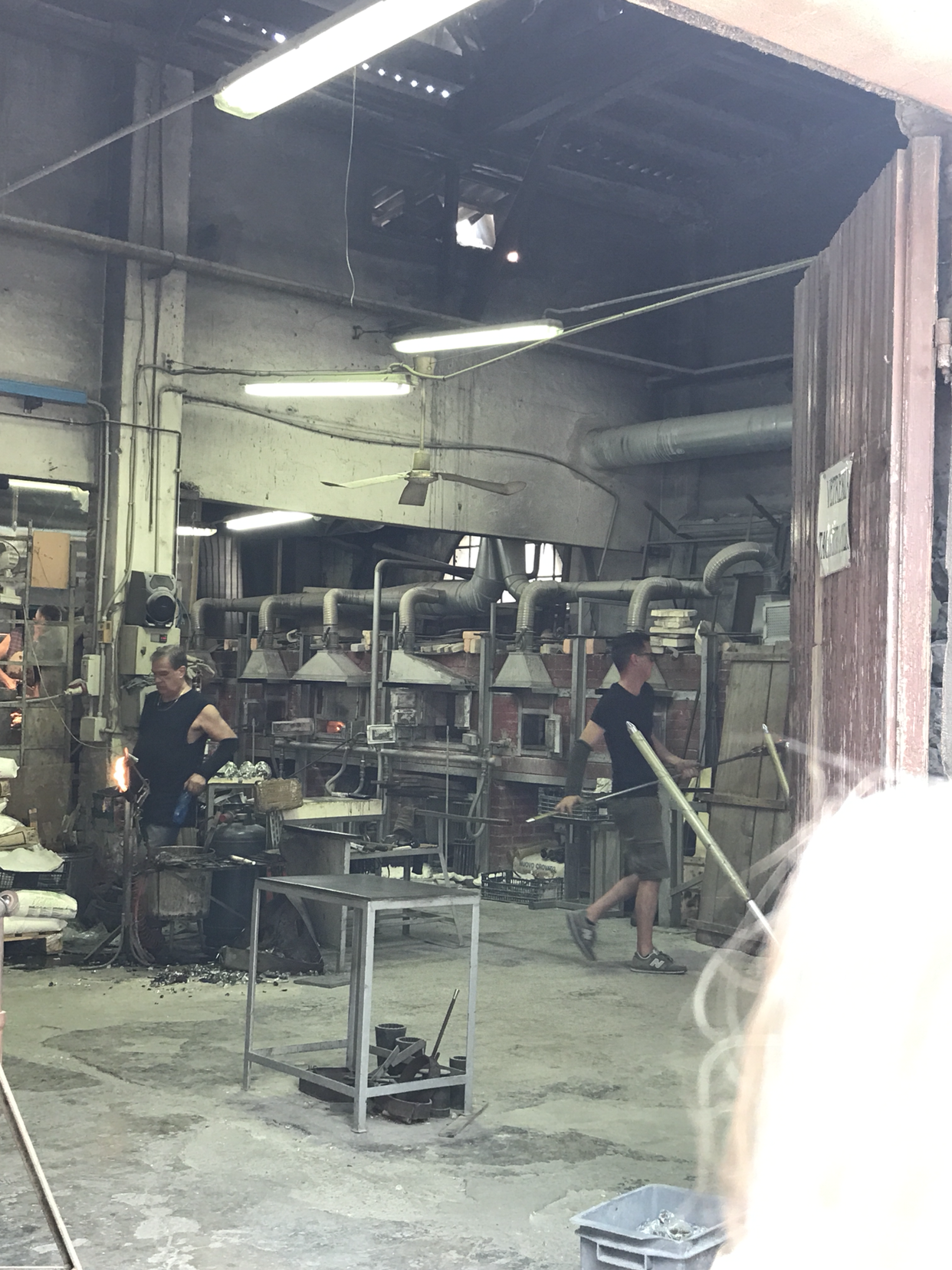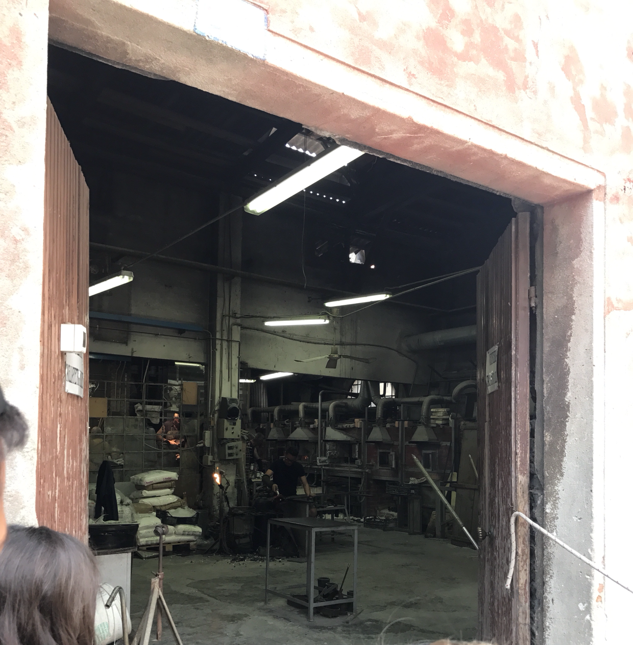아까 산 목걸이를 하고선, 좋아하는 음악을 들으며 터벅터벅 걸었다. 눈과 마음이 호강하고 있지만, 그것이 고파오는 허기까지 막아주지는 못하는 법. 슬슬 바포레토 선착장 근처에서 점심을 먹고 부라노 섬으로 이동해야겠다는 생각이 들었다. 선착장으로 향하다 보니 커다란 창고 앞에 사람들이 모여 구경하고 있는 모습이 보인다. 뭐지 하고 다가가 보니 커다란 유리공장이다. 사람들이 부지런히 뜨거운 불을 마주하고 유리 공예들을 구워내고 있었다. 사람들이 이렇게 드글대며 엿보면 신경 쓰일 법도 한데, 이런 생활이 익숙한 듯 땀을 뻘뻘 흘리며 일에만 집중하는 모습이 존경스러웠다. 이 섬이 이토록 유명해지고 자부심을 가질 수 있게 된 것에는 다 이런 사람들의 노력이 기반이 된 거겠지.