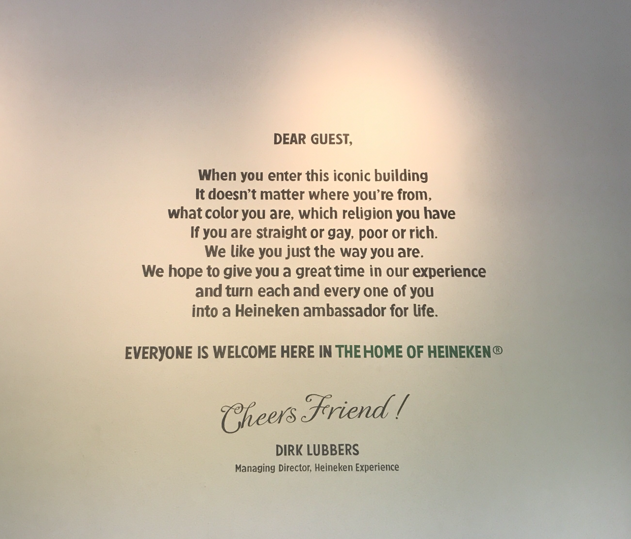 입장하면서 보이는 것은 하이네켄 익스피리언스의 Dear, guest. 인종, 종교, 성적 취향에 구애받지 않고 모두에게 친절한 이 안내문을 보면서, 하이네켄에 대한 호감도가 더 상승한다. (역시, drink resposibly 캠페인도 그렇고, 축구 스폰에 적극적인 것도 그렇고 하이네켄은 사랑받는 법을 아는 브랜드다.)