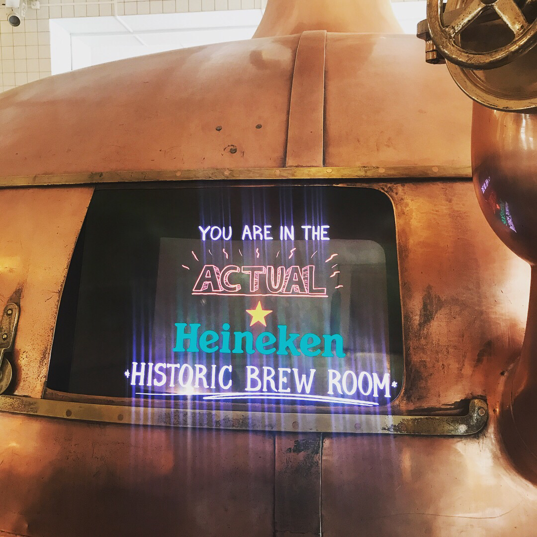 하이네켄의 로고 변천사를 쭉 훑으며 들어가니, 하이네켄 맥주가 만들어지는 과정과 그 재료에 대해서 설명해주는 크루가 보인다. 수 없이 많은 사람들 앞에서 설명을 해와서 그렇겠지만, 이 사람 말솜씨가 개그맨 저리 가라다. 덕분에 투어에 참여한 사람들은 다 하하호호 분위기 업. 심플한 재료들로 그런 상쾌한 맛이 나온단 말이지? 하며 이동하면 하이네켄 브루 룸이 나온다. 맥주를 브루잉 시키는 기계에는 스크린이 달려 있어서, 단계별로 귀여운 그림과 함께 설명이 나온다. 이렇게 비주얼적으로 귀엽게 설명하니 누구나 이해하기 쉽겠다 싶다.