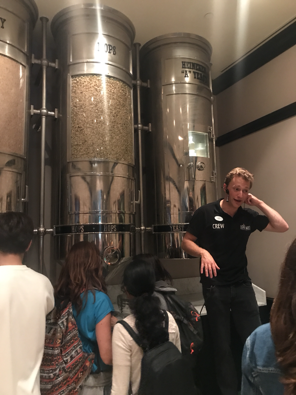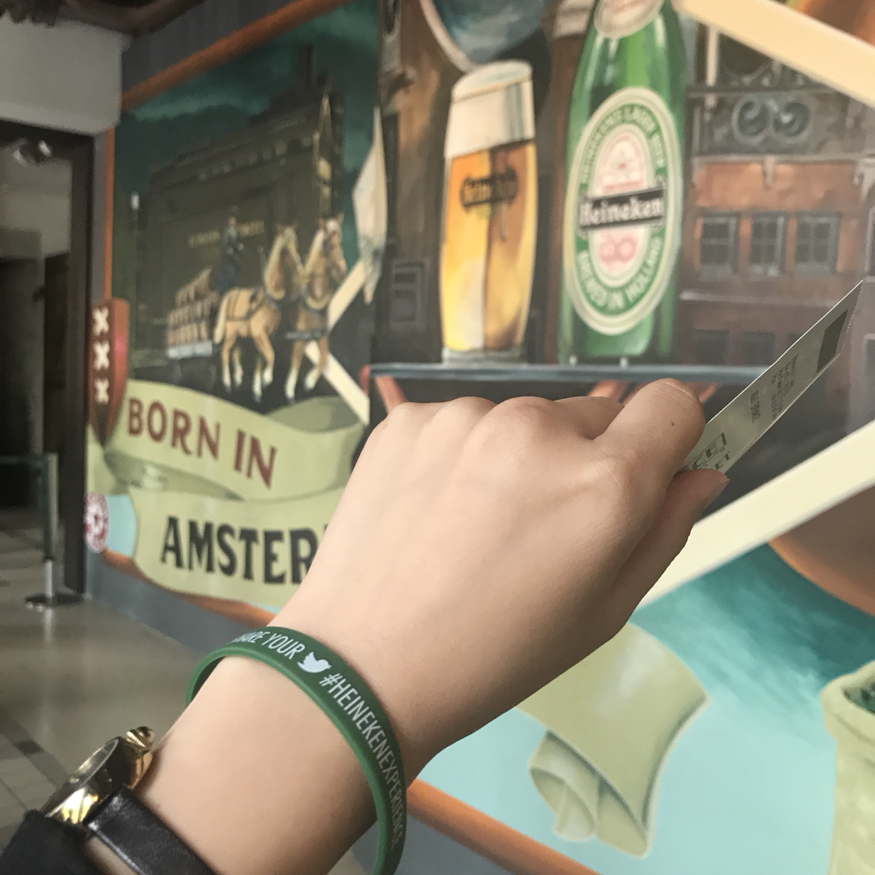 그 할머니는 할아버지랑 거의 매 주말마다 이 하이네켄 익스피리언스에 오는데, 본인은 맥주를 많이 마시지 않는다며, 배지가 남으니 너 이거 가져가서 먹으렴! 하시는 것. 내 주변에 맥주를 오크 통째 들이부을 것 같은 건장한 청년들이 이리도 많은데, 굳이 나에게 배지를 건넨 것은 내가 동양인이라 그런 것인지, 아니면 주정뱅이일 것 같아 그런 것인지 모르겠지만 일단 나는 맥주를 좋아하니 땡큐 베리 머취 하면서 받아 든다. 그 모습에 사교성 좋은 네덜란드 아저씨 부부도 웃음이 팡 터졌다. 새로운 사람들과 몇 마디 대화 나누고 보니 어느새 내 입장 차례. 현장 구매 입장권은 18유로 정도 했던 것 같은데, 홈페이지 사전예약하면 16유로다. 입장권을 사고, 가방은 맡겨놓고. 한결 가벼워진 걸음으로 투어를 시작했다.