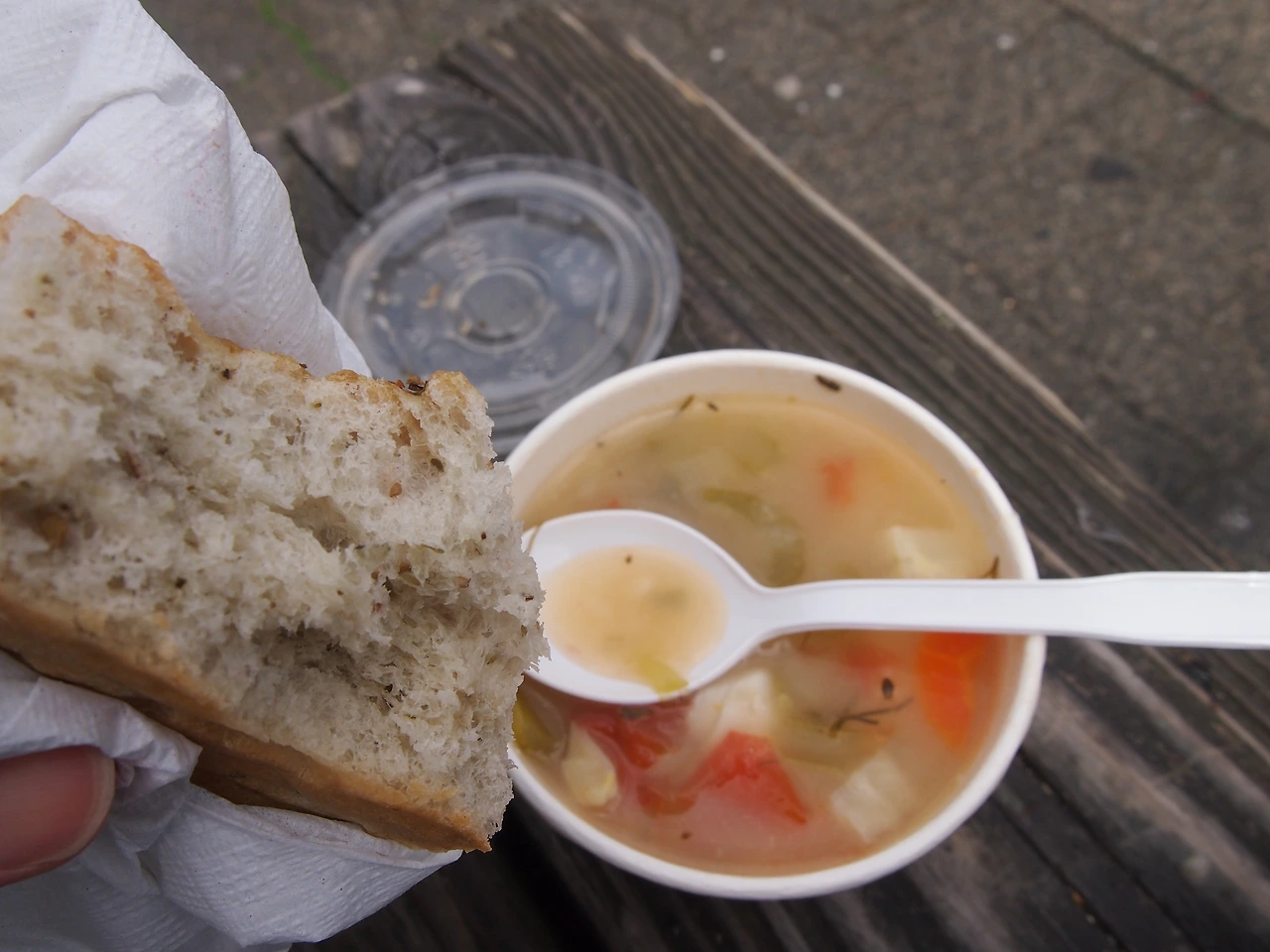 빵과 함께 수프를 테이크 아웃해서 계단에 걸터앉았다. 많은 사람들이 앉아서 바다를 바라보며 여유롭게 식사를 한다. 조잘조잘 사람들의 밝은 웃음소리와 햇살에 빛나는 바다를 바라보고 있자니, 저절로 나도 미소가 지어진다. 10분을 뭘 먹을까 수프 가게 앞에서 고민하다 골라 든 야채수프를 바라보니 더욱 흐뭇한 미소가 가득 퍼진다.