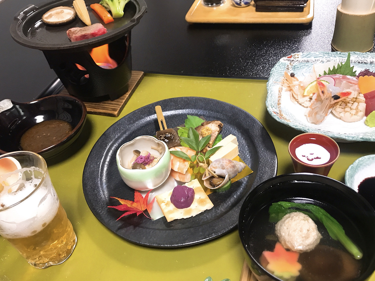다시 방에 들어와 있으니 6시 10분 전에 프런트에서 준비되면 나와서 식사를 하라는 안내 전화를 해주었다. 익숙지 않은 게다를 신고서 종종걸음으로 식당에 들어서니 나만을 위한 정성스러운 일인상이 차려져 있다. 가이세키 요리를 신청해놨기 때문에 전채와 본식, 디저트까지 나의 먹는 속도에 맞추어 준비해주셨다.