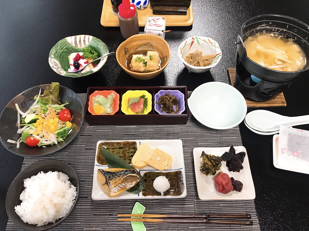 아침은 8시에 먹겠다고 했다. 어김없이 10분 전에 방으로 전화로 알림을 준다. 1박이라는 짧은 기간이라 곧 떠나야 한다는 아쉬움도 잠시, 정갈하게 차려진 아침 밥상을 보니 금세 기분이 좋아졌다, 이 곳에서의 나는 편식 따위 하지 않는 세상 착한 아이다!(회는 빼고..) 아침부터 비가 보슬거리며 와서 산 중턱의 이 료칸을 더 분위기 있어 보이게 했다. 한 곳의 장소를 맑은 날과 비 오는 날, 함께 겪어보는 것을 좋아하는 나로서는 하늘이 돕는 여행이다 싶었다.