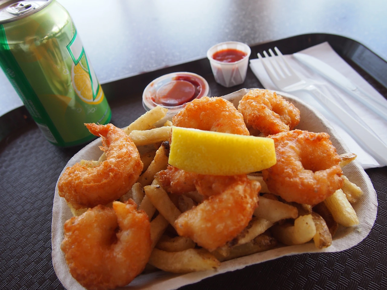 참새가 방앗간 그냥 못 지나친다고, 그랜빌 아일랜드에서 시장들을 신나게 두 번이나 둘러보고 와놓고서 여기서도 또 넋 놓고 이것저것 구경을 하고 있다. 꽃집도 신기하고, 과일도 신기하고, 평소 눈길도 안 주던 주방용품조차 신기하다. 슬슬 배가 고파오기 시작하는데 두리번거리다 보니 피시 앤 칩스 가게가 눈에 띈다. 오늘은 저거다! 하는 생각에 메뉴를 더없이 진지하게 고민하다, 대구로 만든 피시 앤 칩스는 밴쿠버 와서 많이 먹었으니 오늘은 쉬림프 앤 칩스를 선택했다. 날도 따뜻하고 바다도 이쁘니 밖으로 포장해 나와서 먹기 시작한다. 혼자 앉아 먹어도 너무나 기분이 좋다! 맛있기도 하고.