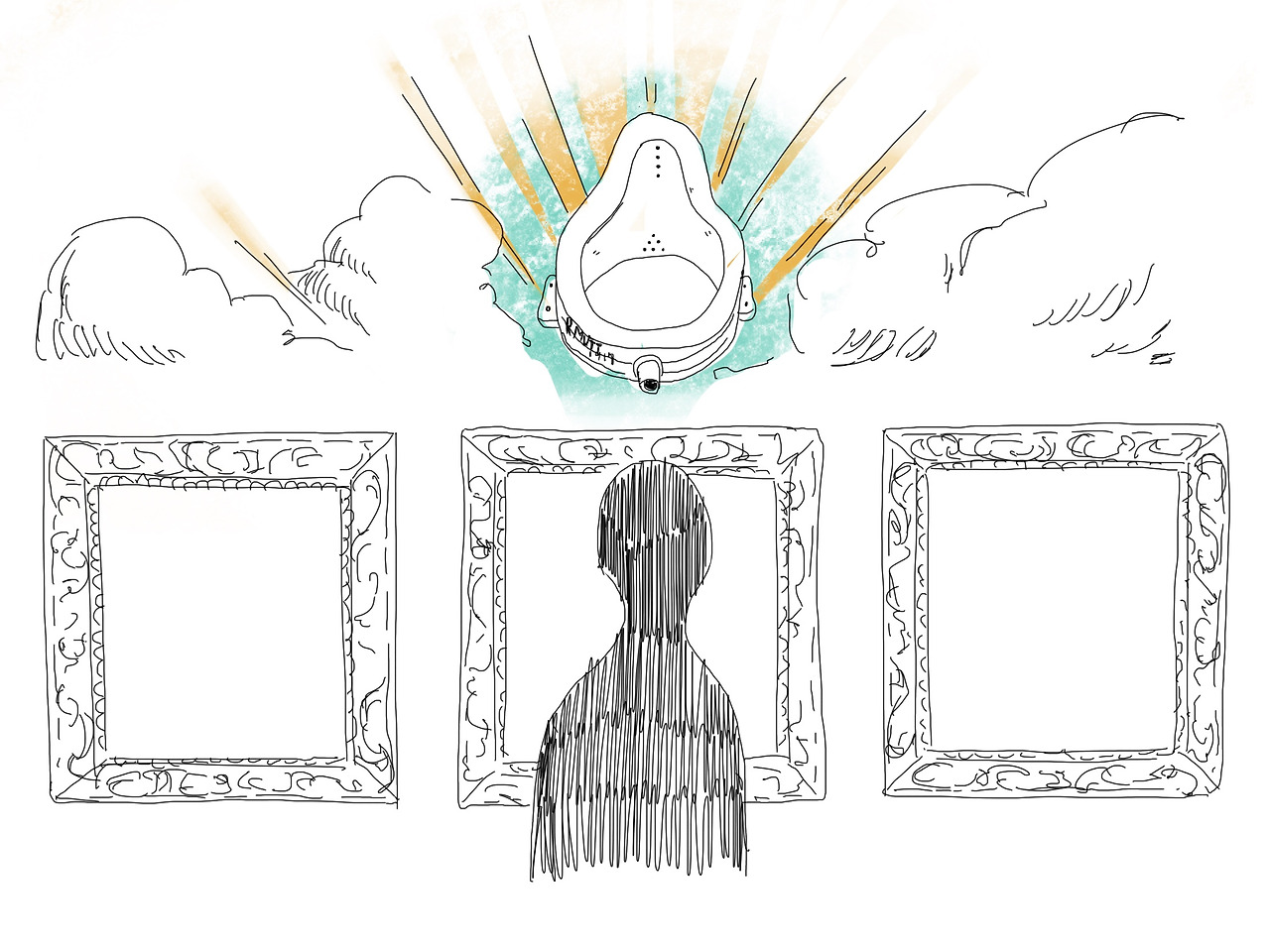전시실에는 「샘」 외에도 자전거 바퀴와 유리잔 걸이 등이 전시되어 있다. 사람들은 이 예술가의 손이 아닌 공장에서 생산되어 나온 물건들의 주위를 돌며 꼼꼼히 들여다본다. 지난 세기의 작품을 보기 위해서. 예술을 보러 오는 일은 다음 세기에도 계속될까? 과학이 아닌 예술이 던지는 질문은 아직도 유의미할까? 세상 속의 한 인간은 어차피 세상을 다 알 수 없다면 애써 질문할 필요가 있을까?