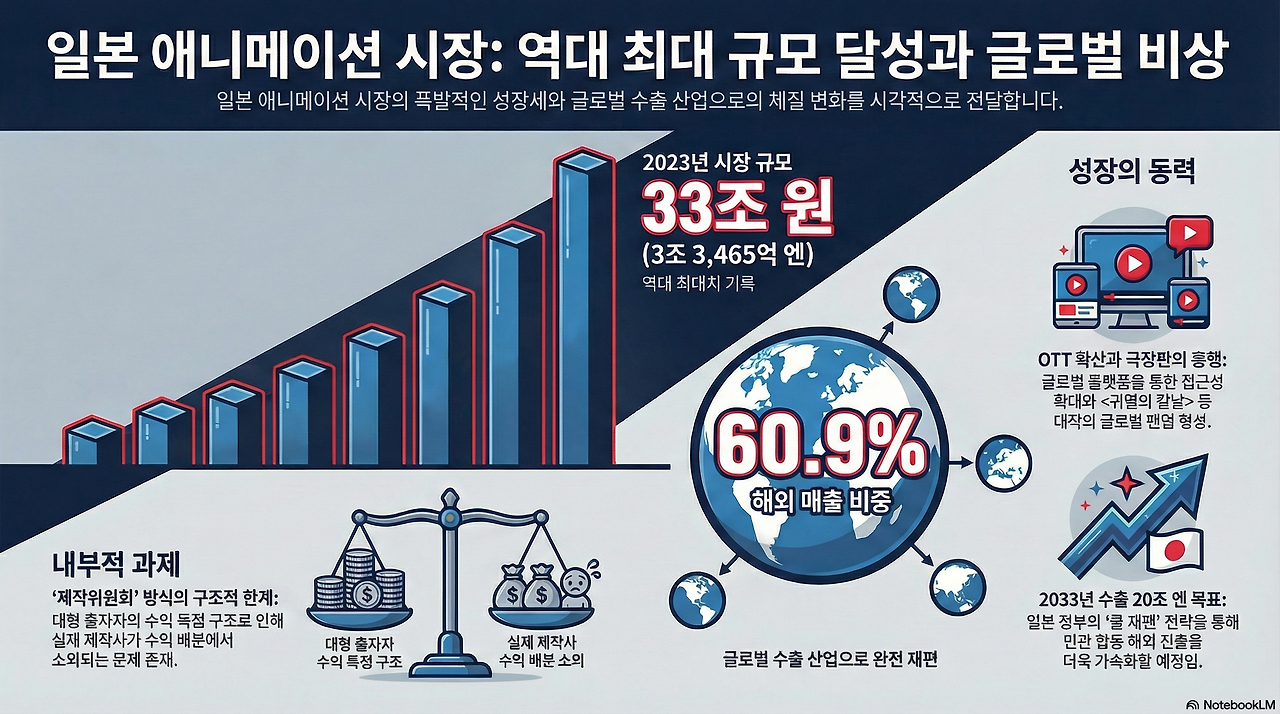 최근 몇 년 사이, 일본 애니메이션 시장은 크런치롤이나 넷플릭스와 같은 OTT에 힘입어 폭발적인 성장세를 보인 바가 있습니다. 덕분에 이미 해외 매출 비중이 60%를 넘어서며 명실상부한 글로벌 수출 산업으로 자리 잡았습니다.