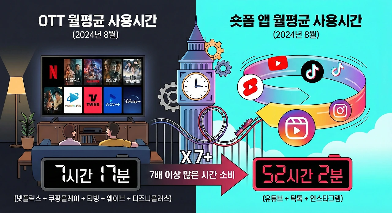 이건 당신만의 이야기가 아닙니다. 2024년 8월 조사에 따르면, 한국인의 숏폼 앱(유튜브·틱톡·인스타그램) 월평균 사용시간은 52시간 2분입니다. 하루 평균 1시간 44분. OTT보다 7배 이상 많은 시간입니다.