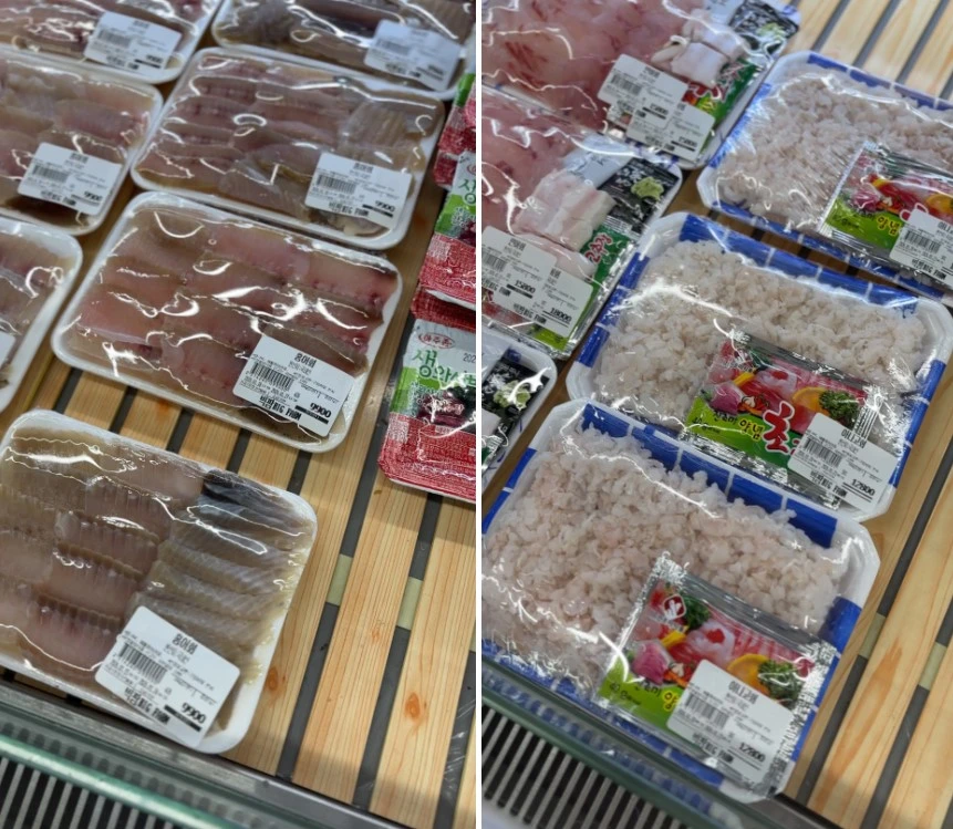 여수에 왔다는 걸 가장 실감하게 한 곳은 해산물 코너였다. 먹기 좋게 손질된 회가 적당한 가격으로 포장되어 진열되어 있었다. 여행객이 숙소로 가져가 바로 먹기 좋은 구성이었다. 우리는 이미 회 포장 전문점에서 따로 구매해 둔 상태라 구경하며 군침만 삼켰다. 전라도답게 홍어도 판매 중이었다. 지역의 색이 자연스럽게 묻어 있는 해산물 코너의 진열대였다.