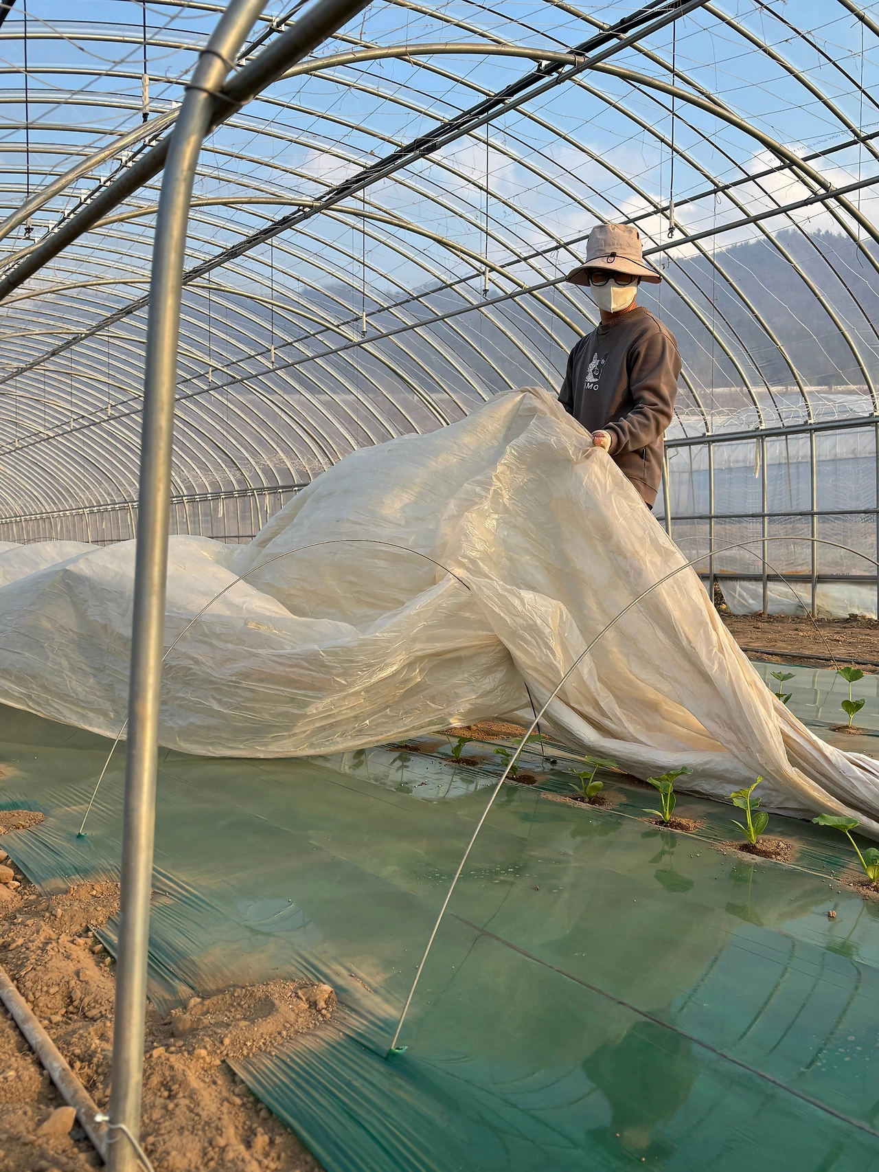 아침 서리가 내렸을 뿐 햇살이 강하지 않고 구름이 낀 날씨라 오히려 일하기에는 괜찮았다. 너무 햇살이 강하면 일하는 사람도, 작물도 힘들다. 적당히 흐린 날씨 덕분에 오전 동안 두 줄을 후다닥 심고 작업을 마칠 수 있었다. 정식 후 옮겨 심은 녀석들이 안전하게 뿌리를 내리게 하기 위해 터널을 만들고 이불(부직포)을 덮었다. 이제 아침, 저녁으로 이불을 걷고, 덮는 게 일상이 될 것이라는 걸 안다.