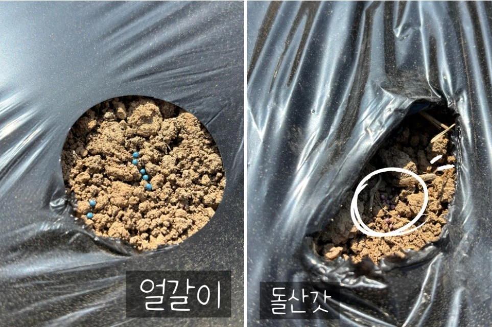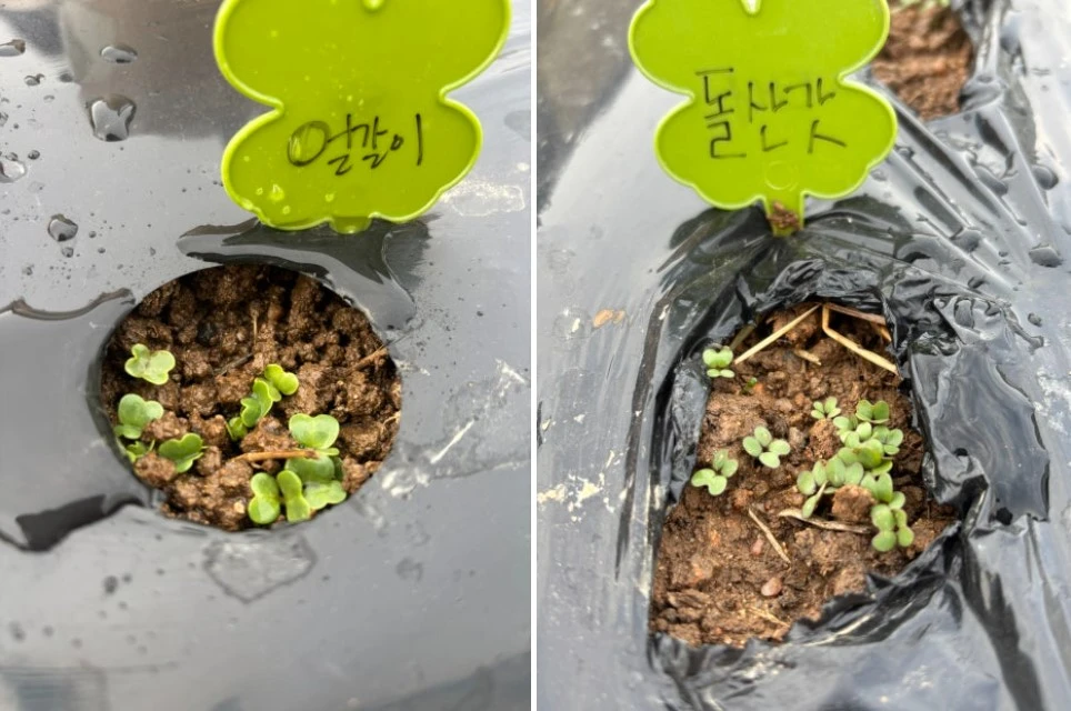 올해도 어김없이 얼갈이와 돌산갓을 함께 파종했다. 다만 올해는 흙 상태가 변수였다. 비가 자주 내려 땅이 질퍽하게 뭉쳐 있었고, 손으로 만져도 쉽게 부서지지 않았다. 이런 상태에서는 씨앗이 제대로 자리 잡지 못할 수도 있어 걱정이 됐다. 그래서 한 구멍에 2~3개씩 넣던 걸, 올해는 조금 더 과하게 넣었다. 씨앗 봉투를 들고 구멍 위에서 촥촥 흔들면서 에라~ 모르겠다는 마음으로 들이 부었다. 그렇다보니 몇 년 동안 사용해 온 열무 씨앗은 이제 몇 개 안남았지만, 돌산갓 씨앗은 여전히 넉넉하게 남았다.