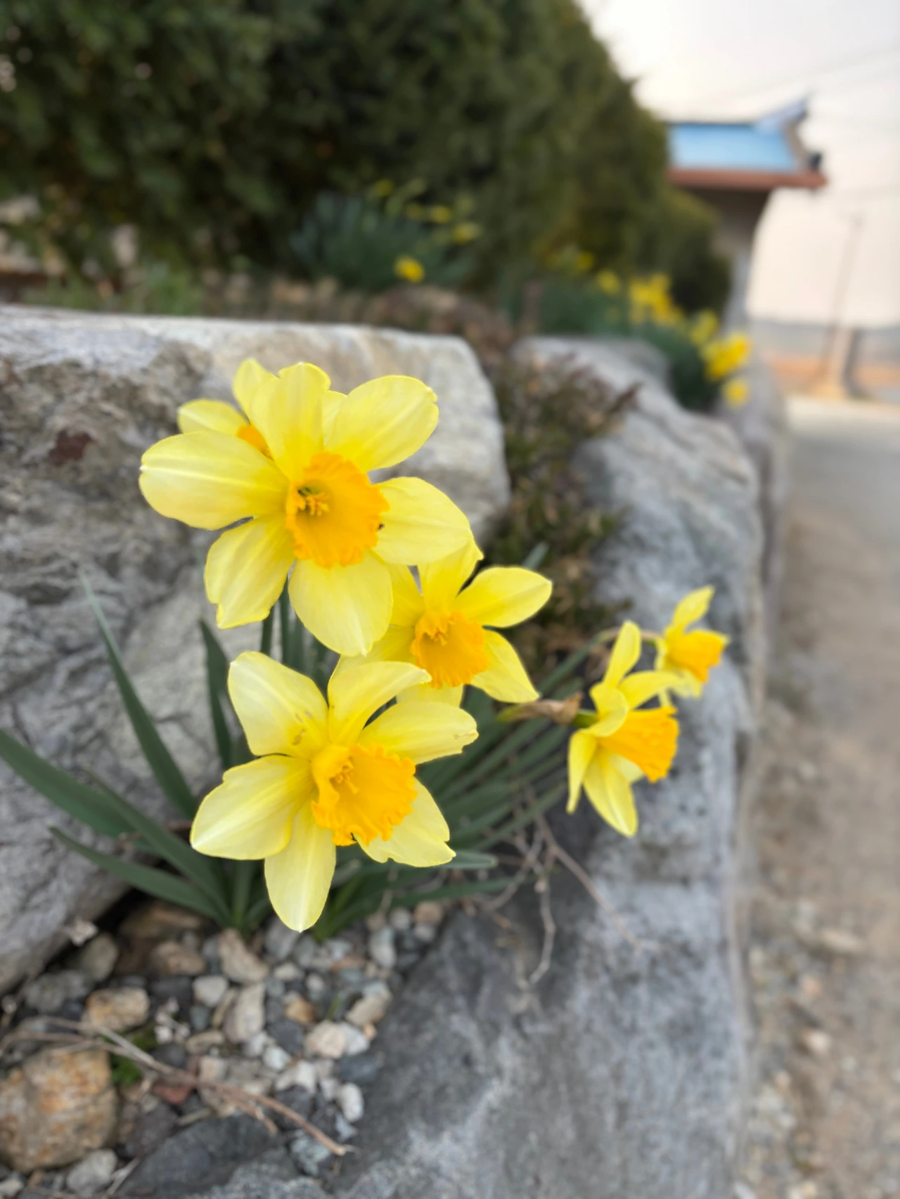 그 집 돌담은 큼지막한 돌을 낮게 쌓고, 그 위에 흙을 얹어 만든 자연스러운 화단이었다. 돌 사이사이에 흙을 채우고 그 틈에 구근을 심어 두어, 계절이 바뀔 때마다 다른 꽃들이 피어났다. 그중에서도 봄의 시작을 알리는 건 수선화였다. 지나가던 발걸음을 잠깐 멈추게 만드는 꽃, 그게 수선화였다.