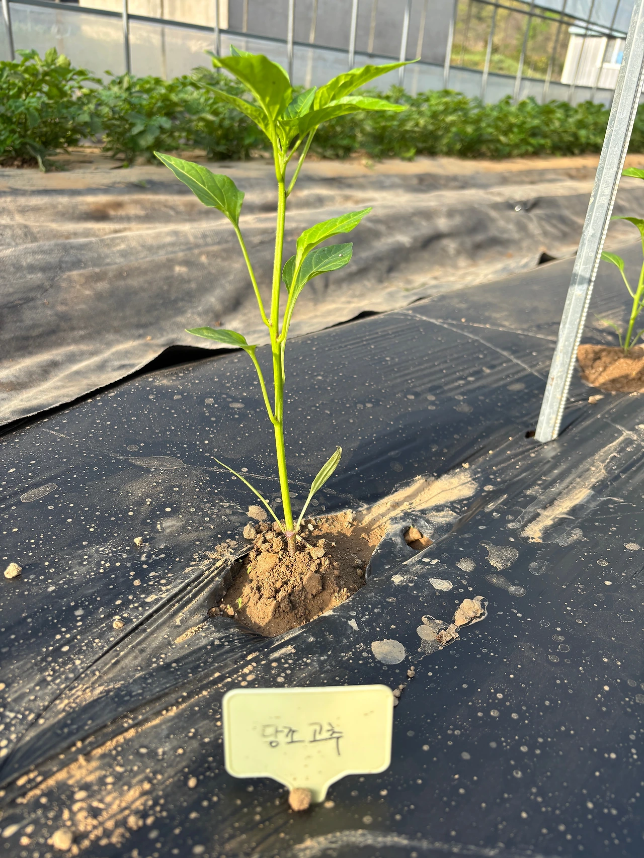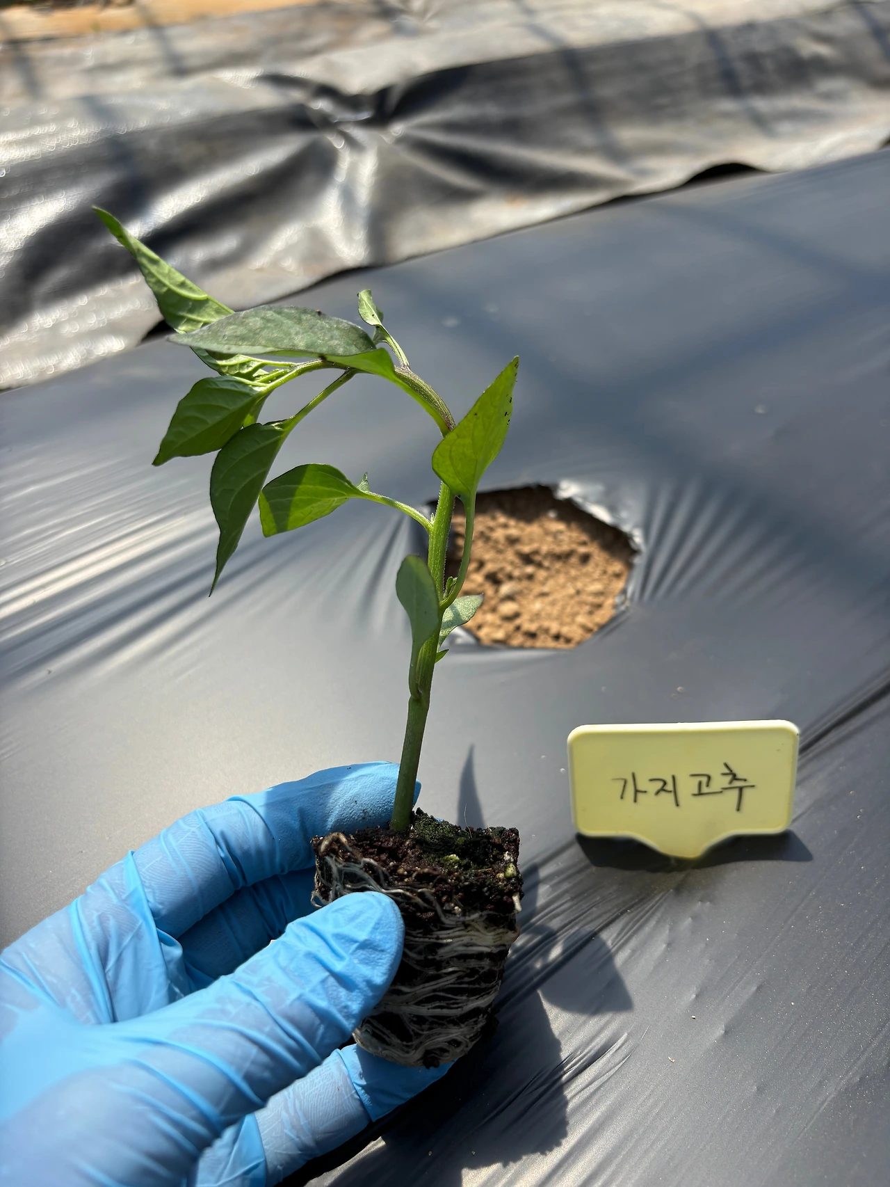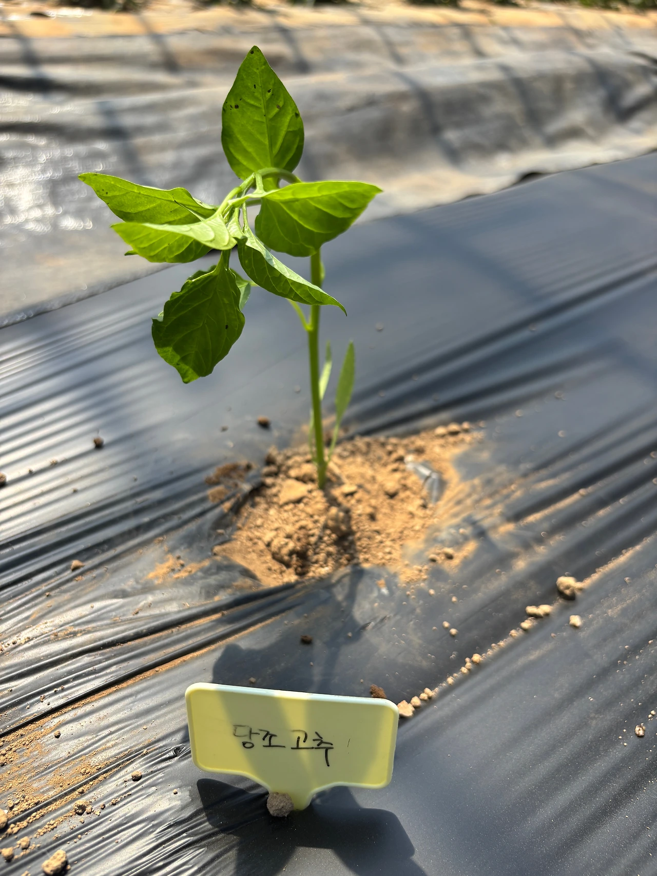 올해는 오이고추 대신 헬로풋을 선택하고, 당조고추, 가지고추, 청양고추까지 네 가지로 정했다. 오이고추나 헬로풋이 풋고추 계열로 품종이 겹쳐서 헬로풋을 선택했다. 지난 4월 8일, 총 6개의 고추 모종을 비닐하우스 안에 심었다.