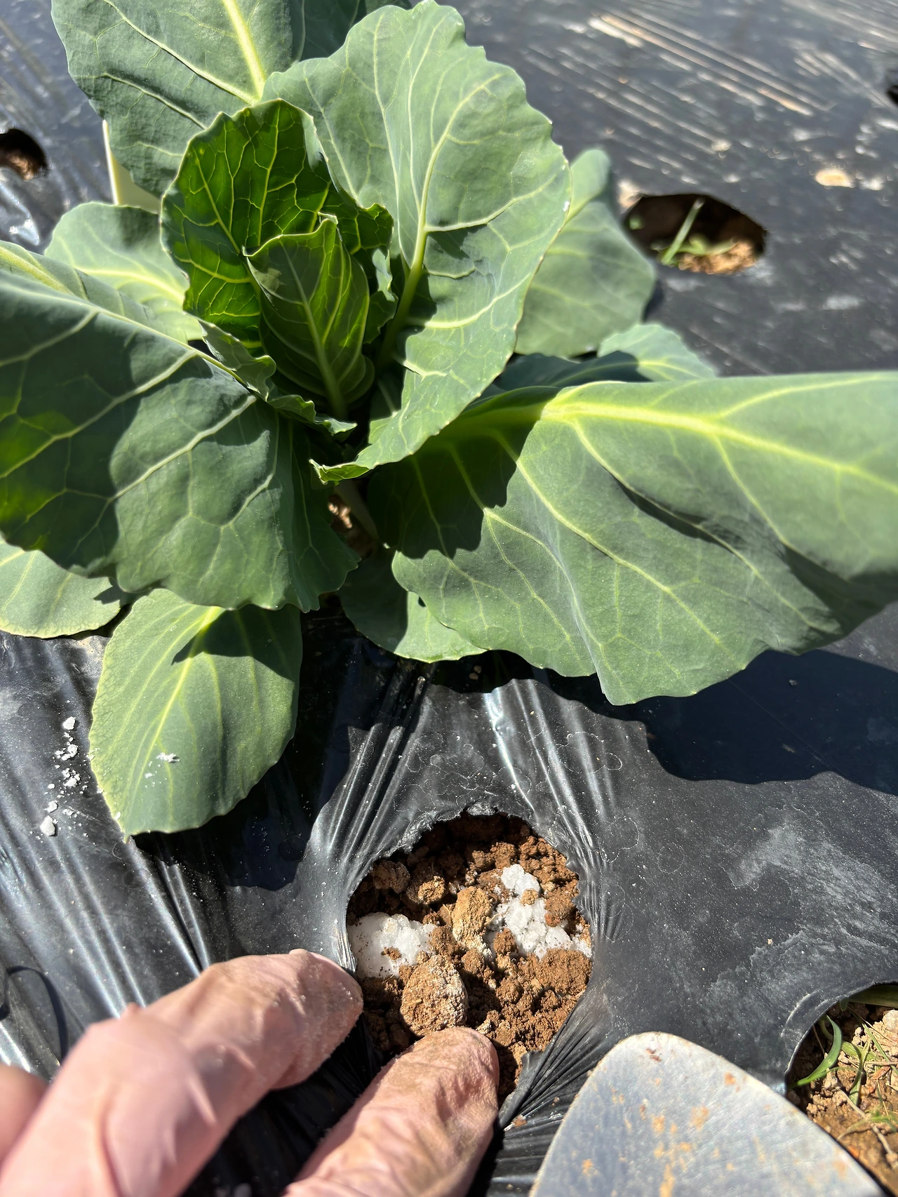 양배추 바로 옆이 아니라, 조금 떨어진 곳의 비닐을 살짝 찢고 흙을 팠다. 그 안에 요소를 소량 넣고 다시 흙으로 덮었다. 뿌리에 직접 닿지 않도록 거리를 두고 주는게 좋다.