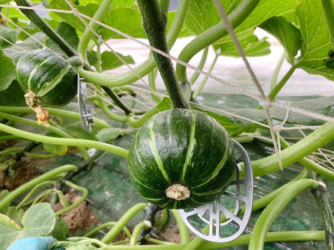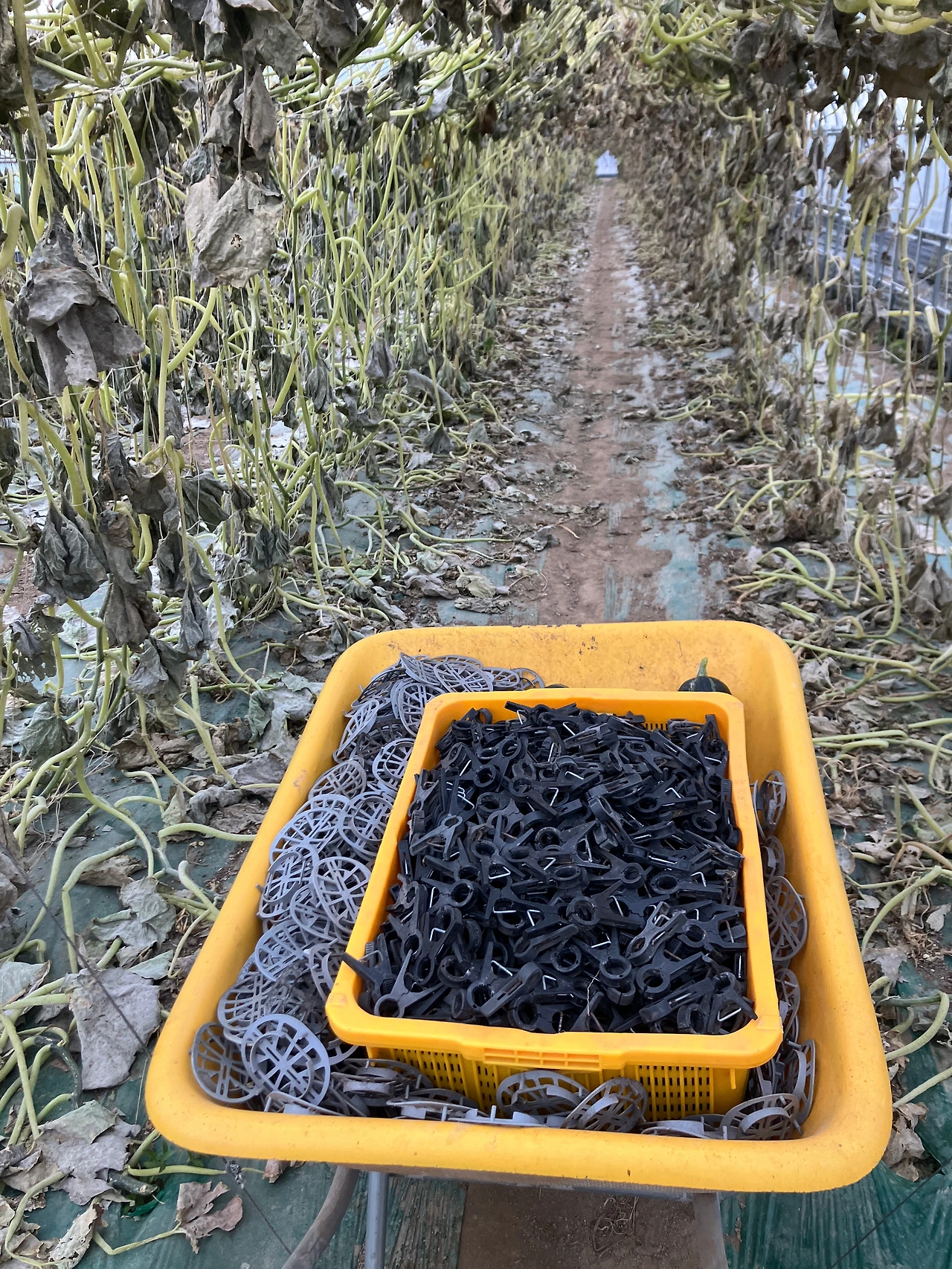 밤호박은 공중재배로 키운다. 공중에 매달기 위해 그물 위로 밤호박 줄기를 유인할 때 사용하는 것이 농사용 집게이다. 결속기를 이용하기도 하지만, 우리 농장은 재사용이 가능한 집게를 사용하고 있다. 바닥에 유인재배로 키우는 것보다 매끈한 모양새의 밤호박이 되지만 줄기와 잎에 의해 스크래치가 덜 나도록 받침대를 받쳐 준다. 바로 이 녀석들을 수거해야 한다.