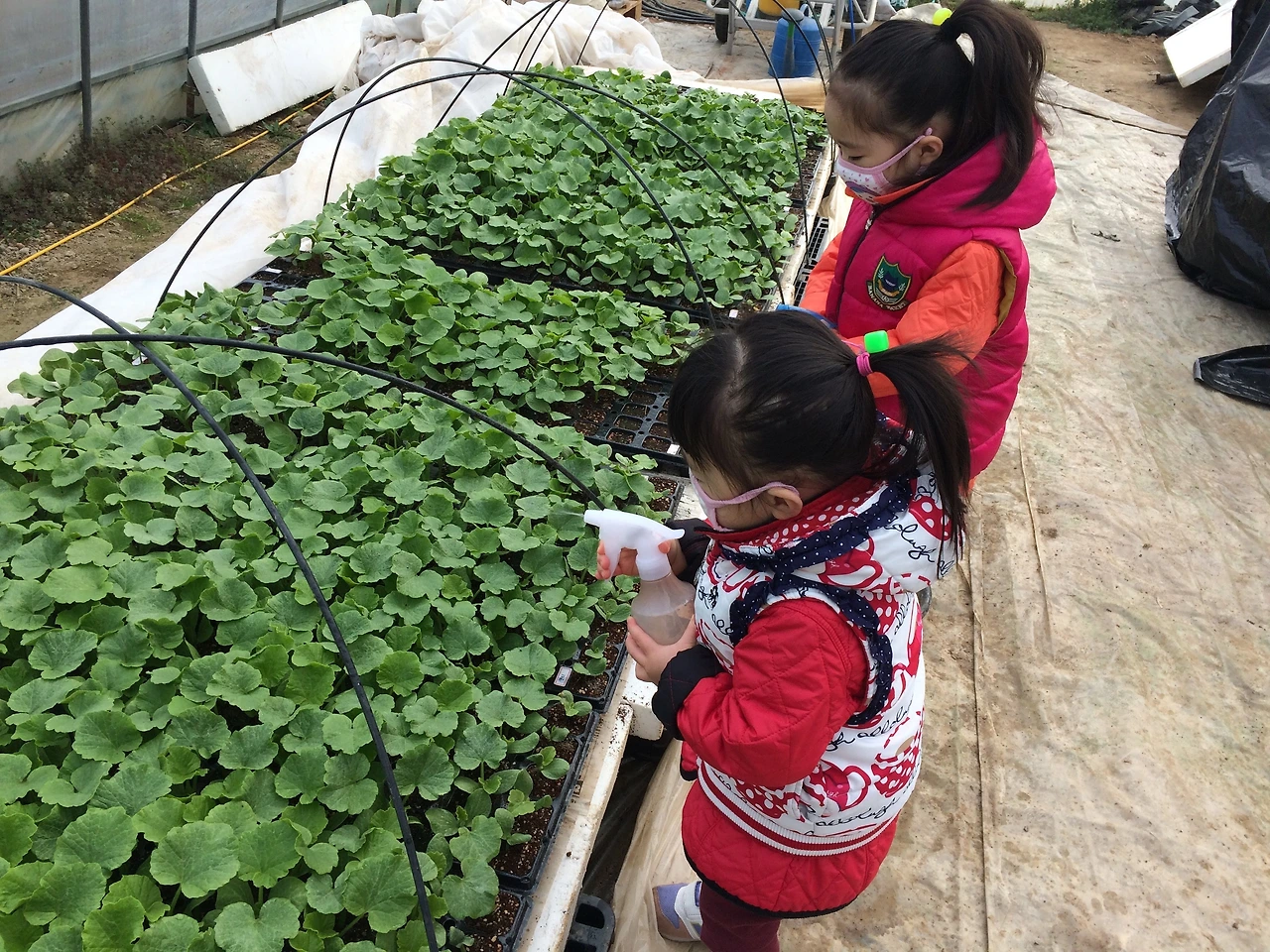 한낮에는 부직포를 걷어 햇빛샤워를 시키고, 해질녘에 다시 덮어 보온에 신경을 썼다. 열선의 온도도 조절을 해주면서 정성 들여 밤호박 모종을 키웠다. 가끔 어린이집에 가기 전 아이들에게도 분무기 하나씩 쥐여주고 함께 물을 주었다. 그럴 때면 아이들은 주문처럼 읊었다.