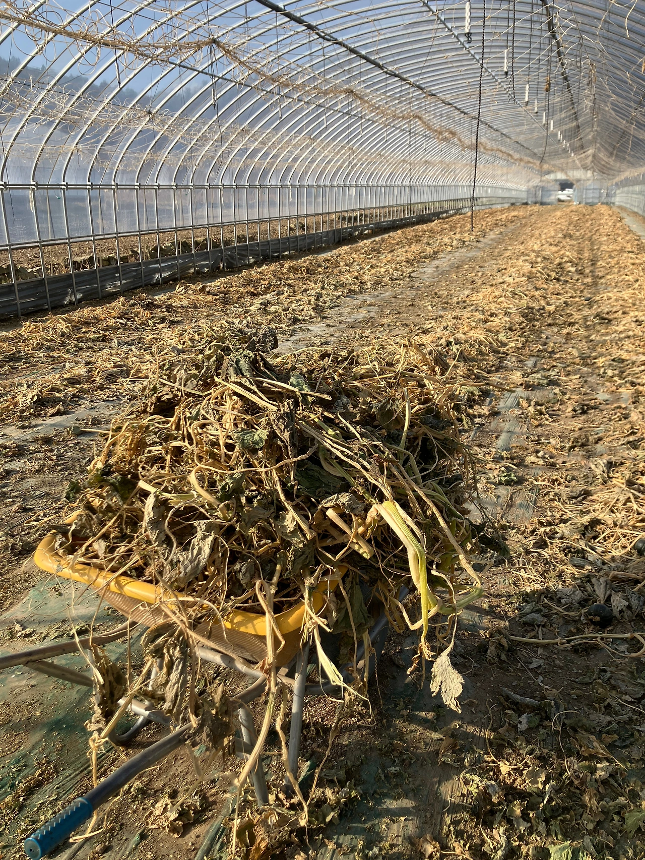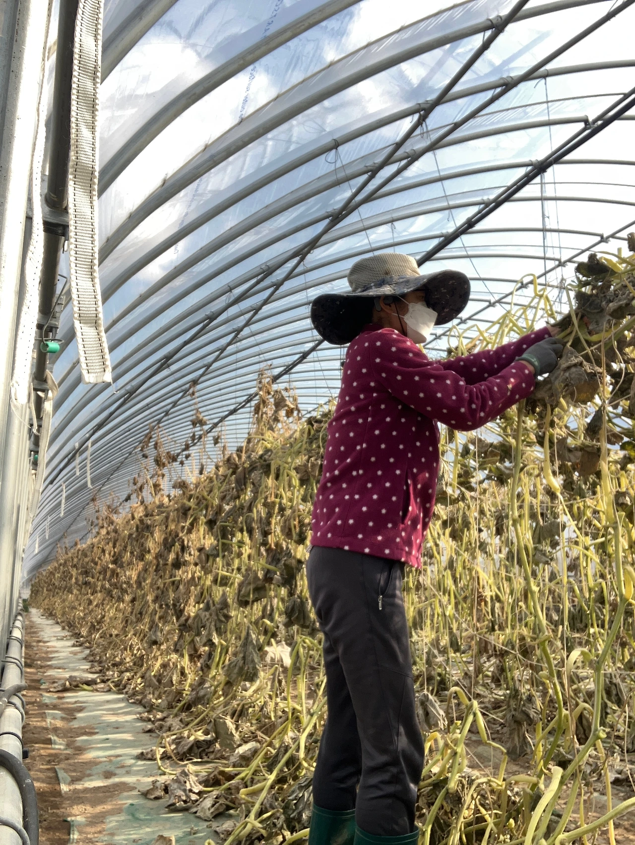 있는 힘껏 그물에 매달려 있는 밤호박 줄기를 잡아당겨 바닥에 떨어뜨렸다. 오후에만 출근하니 하우스 2동, 그물과 줄기 분리작업을 하는데 열흘이나 걸렸다. 조금씩 일을 나눠 며칠에 걸쳐 일하는 것은 역시 도비 성질에는 맞지 않았다. 시작하면 바로 끝을 봐야지~