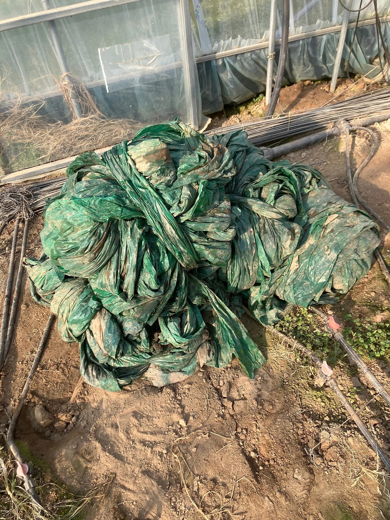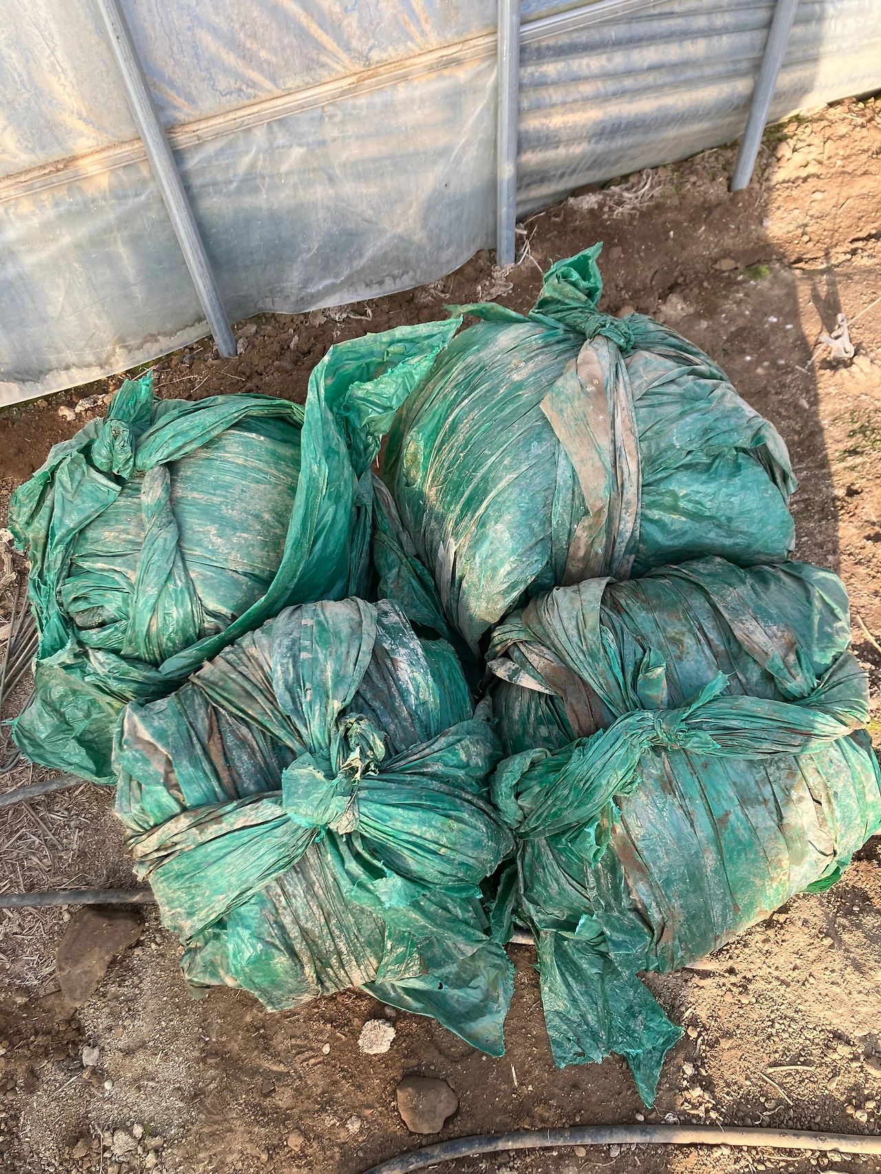 작년(2023년)까지만 해도 먼지 따위 신경쓰지 않고 삐져 나오는 비닐은 보이지 않도록 예쁘게 돌돌돌 말아서 정리를 했다. 흡사 고급스런 보자기 포장을 한 것처럼 보이게 예쁘게 말았다. 보자기 포장의 손잡이같은 걸 만들어 주면 멀칭 비닐 이동시에도 편하다는 편리성까지 더해져 마음에 들었다. 네모나게 각을 맞추고 탱탱하게 잡아당겨 들고 가다가 풀리지 않게 꽉 매어 놓은 모습이 외모지상주의의 노동자다운 작업이다. 혼자만 아는 뿌듯함과 만족감이었다.