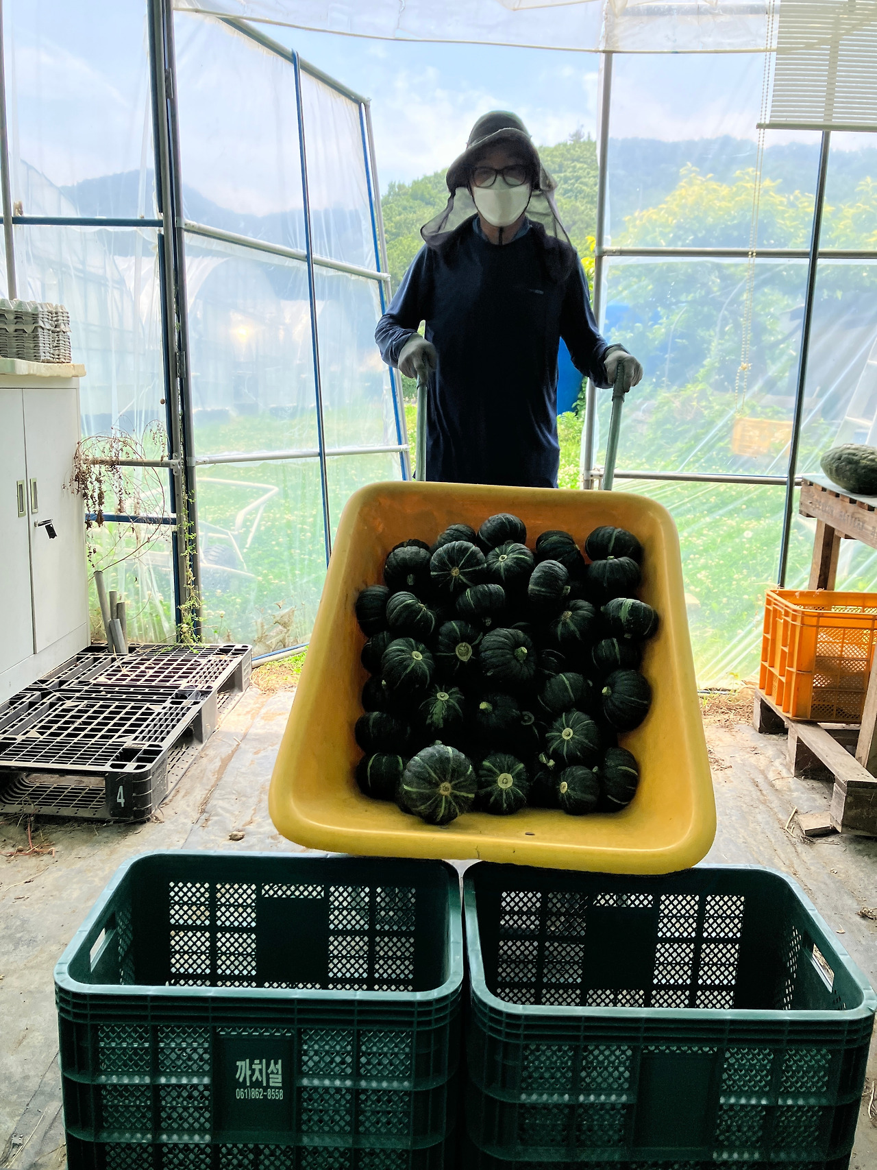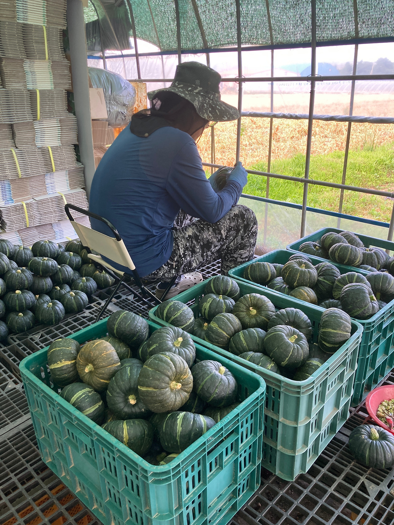 밤호박은 후숙을 해야 하는 작물이다. 수확 후 꼭지를 다듬고 브러시 기계에 먼지를 털고 2주 정도 후숙기간을 가진다. 수확은 농부님 몫이다. 수확해서 수레에 담아 후숙하우스로 가져오면 내가 손질을 하고 다듬는다. 귀농 초반에는 손질도 둘이서 함께 했다. 손에 밤호박을 들고 손질을 하니 팔목이 아프다. 팔목이 아프던 허리가 아프던 어찌 되든 빨리 손질을 끝내고 싶어서 일부터 시작하는 반면, 농부님은 최적의 조건을 찾아 되도록 덜 아프게 세팅을 한 뒤에야 작업을 시작한다. 물론 마음의 준비도 해야 한다. 의자에 호박을 올려놓고 하면 손목이 덜 아프다, 쪼그리(작업 방석)에 앉지 말고 의자에 앉아서 해라~ 등 몸 생각하지 않고 일만 하는 나를 나무란다. 듣는 척하다가 기껏 신경 써 준 보람도 없이 원래 내 방식대로 돌아가니 결국 수확은 농부님이, 손질은 내가 하는 것이 편해 암묵적으로 일을 나눠서 하게 되었다.