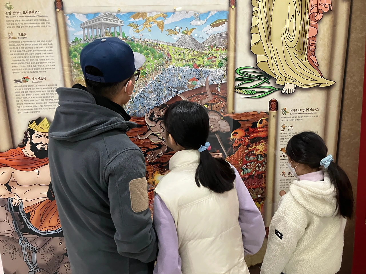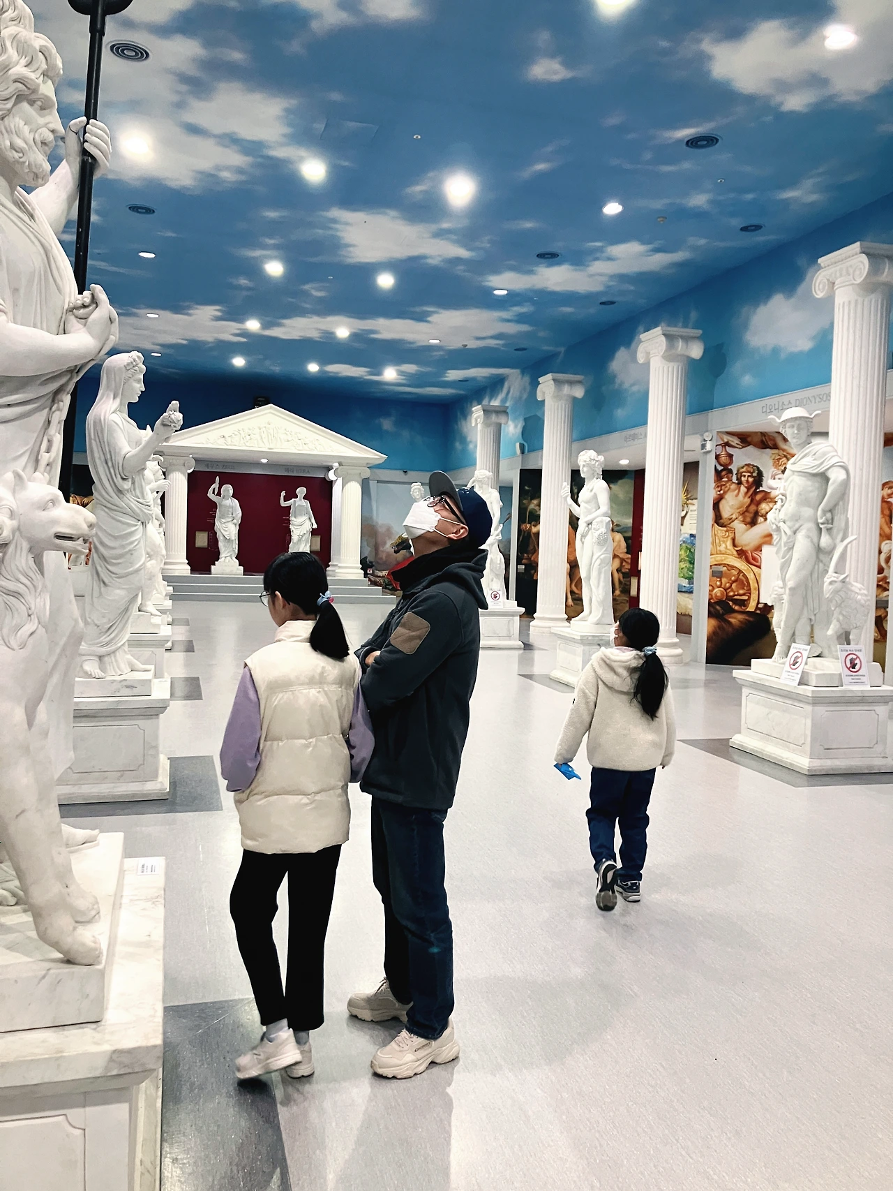 홈페이지에서는 의상 체험, 스탬프 투어 등 다양한 체험 활동이 있다고 안내되어 있었지만, 우리가 방문했을 때는 그런 프로그램이 운영되지 않았다. 그리스 신화 속 인물로 변신할 수 있는 의상 체험이 가장 기대되었는데 실망스러웠다. 스탬프 투어도 장식만 남아 있을 뿐, 종이를 찾을 수 없었다. 기대했던 체험들이 빠져 있어 아쉬웠지만, 다행히 숨은그림찾기 코너가 조형물마다 있어 그나마 재미를 찾을 수 있었다. 가족 모두가 몰입해 벽면 곳곳에 숨겨진 신화 속 인물들을 찾았다.