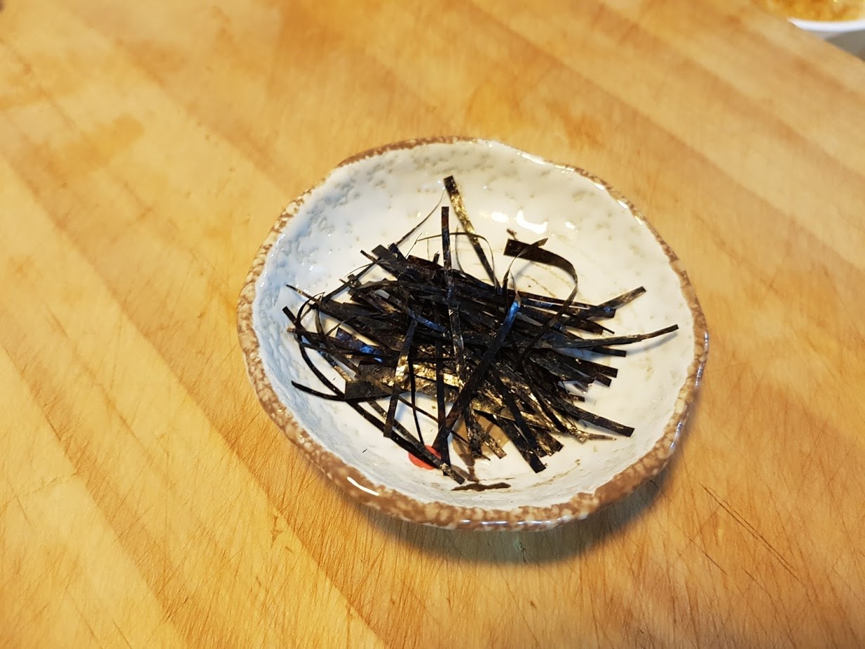 성게알과 연어알을 대체할 저렴이 날치알과 김밥용 김을 잘게 썰어서 준비한다. 김은 가위로 자르는 게 편하다.