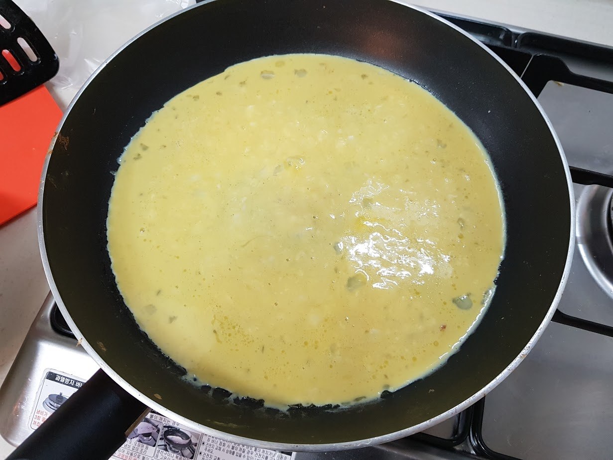프라이팬이 달구어지면 버터를 한번 발라주고 계란물을 붓는다.