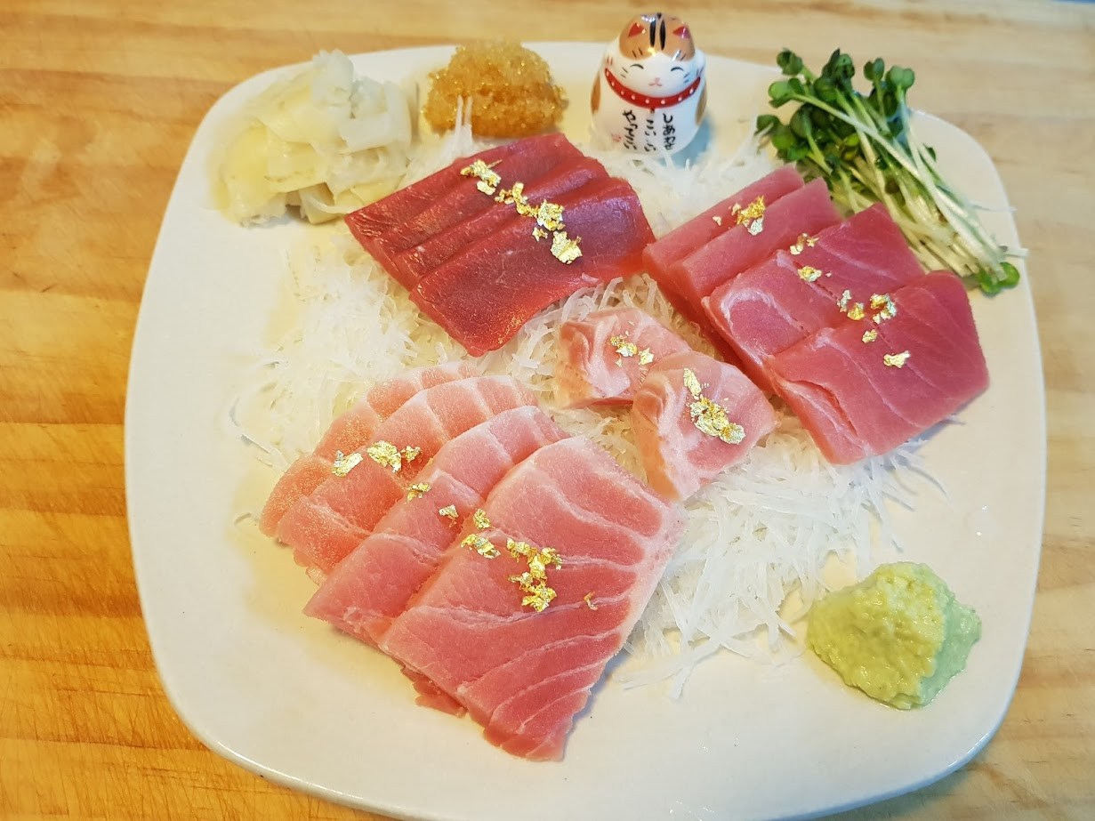한 상을 차렸다. 윗부분의 빨간 살은 북방 참다랑어 속살이다. 아랫부분들이 남방 참다랑어 뱃살이다.