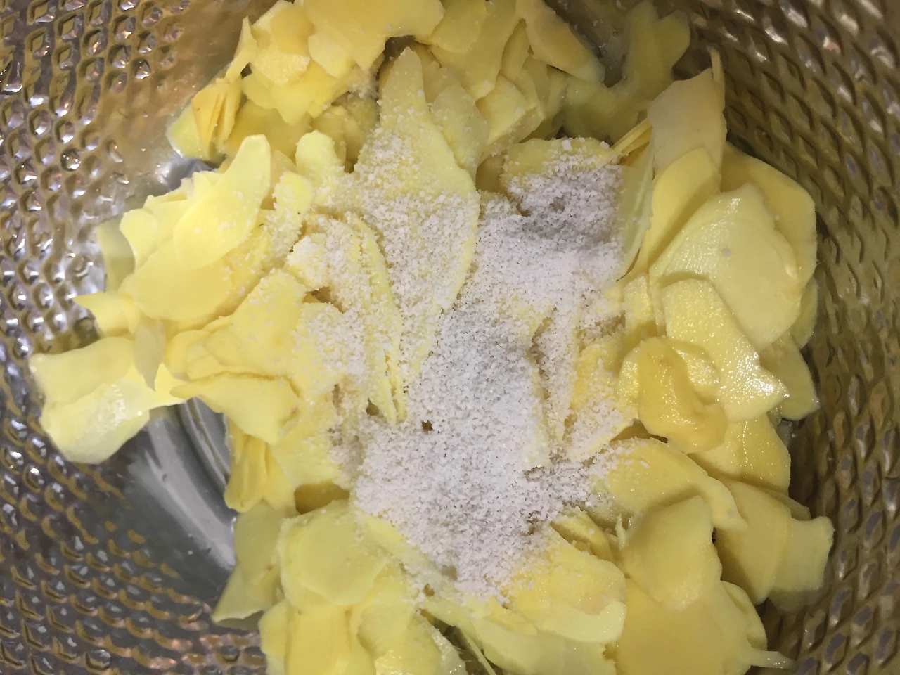 최대한 얇게 썰어 주어야 하는데, 아무래도 채칼을 쓰는게 좋다.