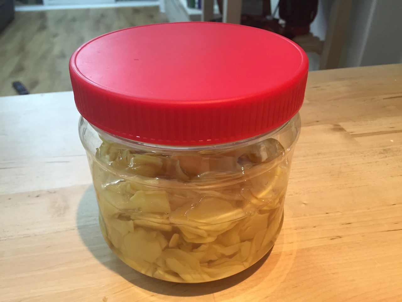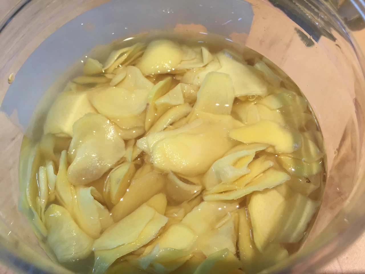 절여진 생강을 손으로 꽉 짜서 소금물기를 최대한 뺀 후, 준비한 촛물에 담그어 주면 된다.