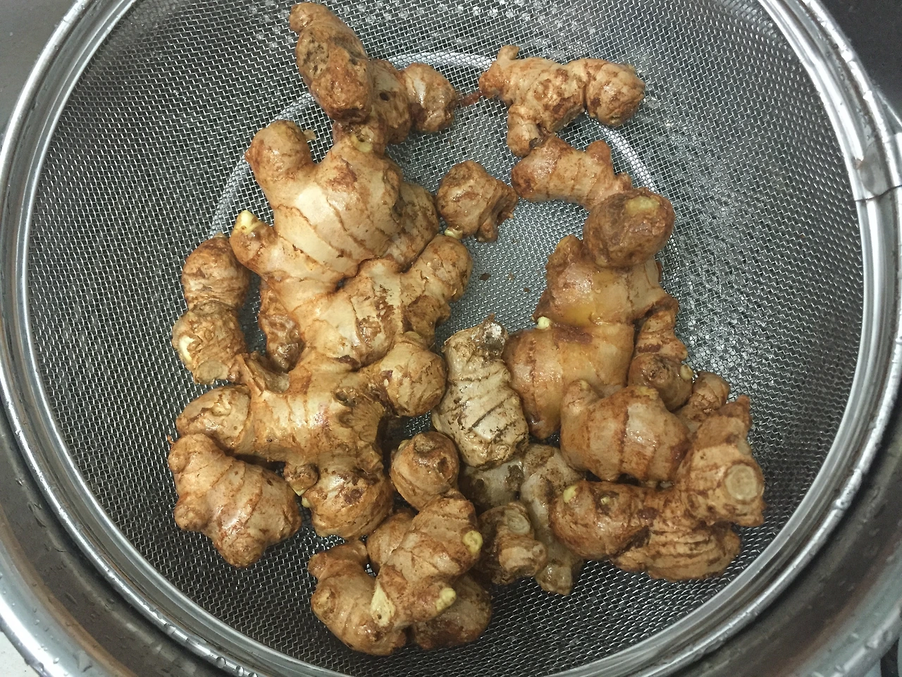 감자칼로 깎는데 생강 모양이 일정하지 않으니 여간 힘든게 아니다. 손가락이 얼얼하다.