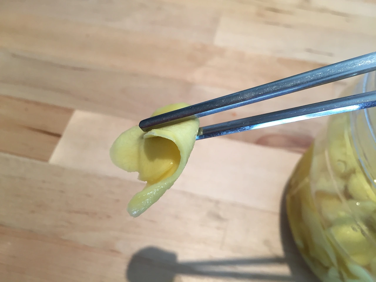 시중에 파는 제품 초생강은 단맛이 강한 편인데, 직접 담근 초생강은 단 맛보다 약간 매운 편이다. 생강 맛이 제품보다 더 강하게 느껴진다.