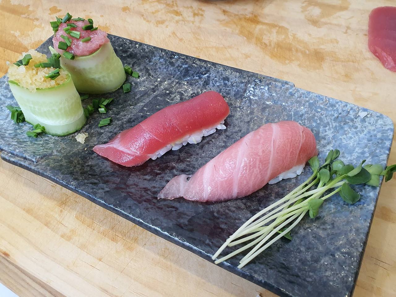 고추냉이를 아낌없이 넣었는데도 참치 기름기 때문에 초밥이 전혀 맵지 않다.