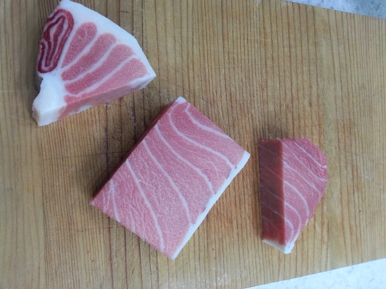 회는 두툼하게 썰어내는 게 맛이 좋다고 하지만 참다랑어 뱃살류는 느끼함을 줄이기 위해 조금은 작게 또는 얇게 썰어내는 게 식감이 더 좋다.