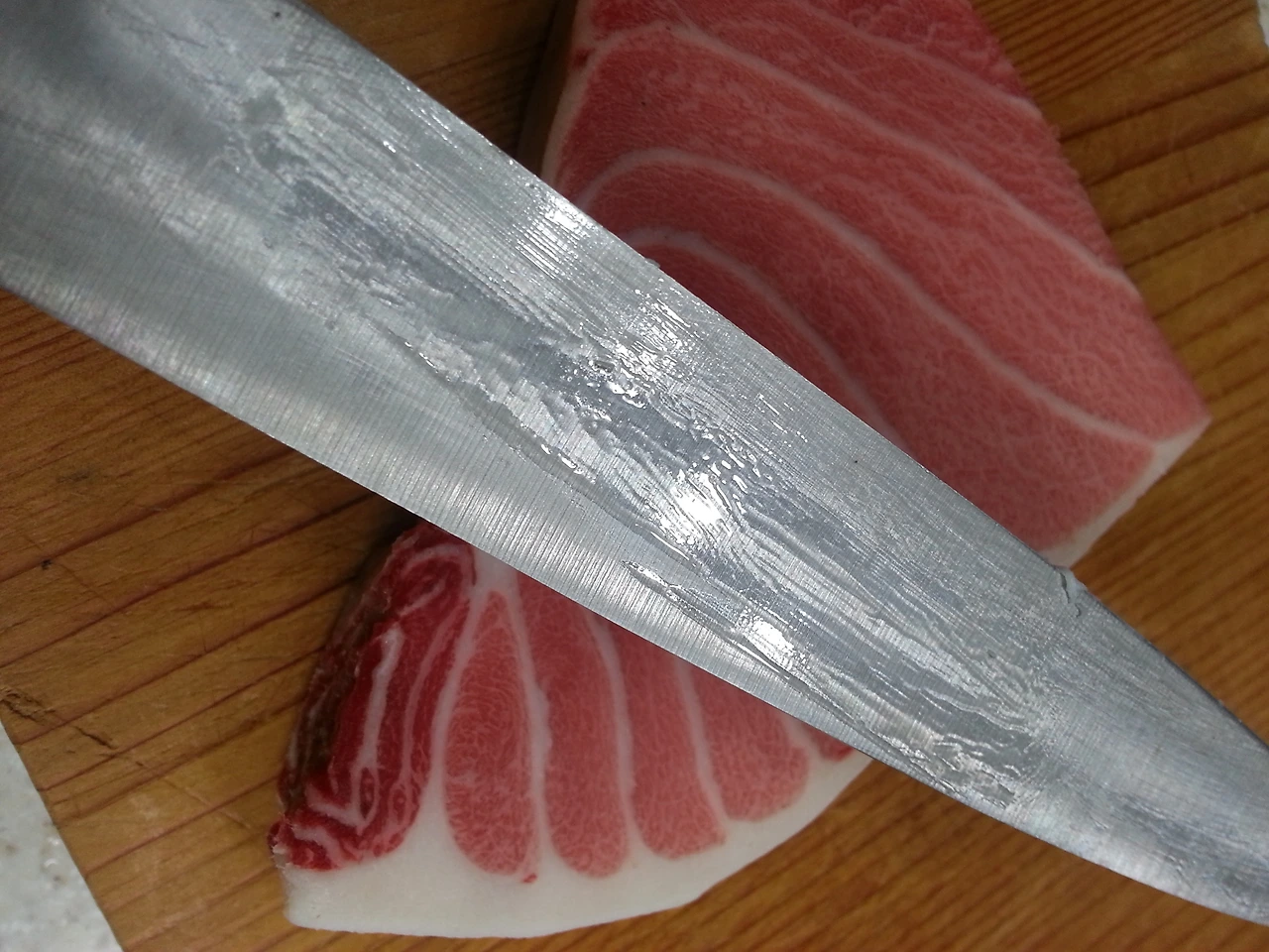 기름기가 얼마나 심한가를 보면 한 번 잘랐을 뿐인데 칼에 저렇게 기름기가 묻어난다. 많이 알려졌듯이 참치에서 나오는 기름은 불포화지방이라 좋은 기름이라고 한다.