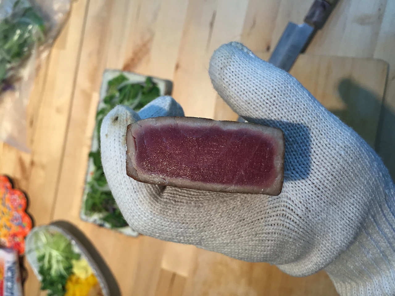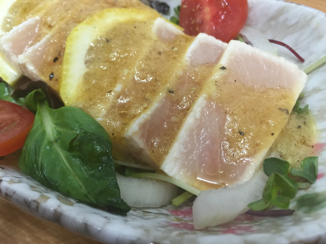 시험 삼아 만들어 본 가다랑어 타다끼이다. 아직 소스는 뿌리기 전.