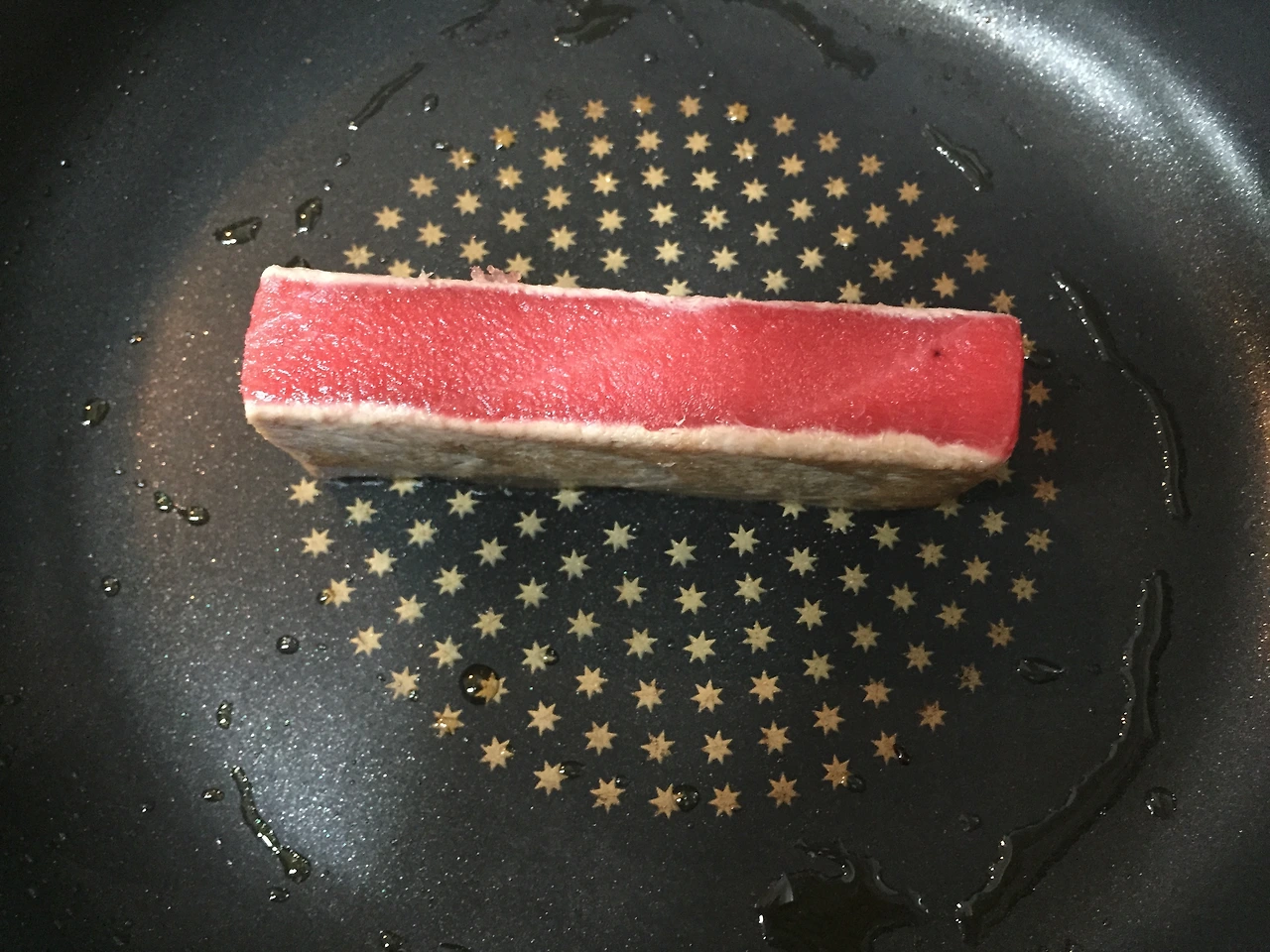 아카미를 프라이팬에 겉을 익힌다. 식용유는 조금만 뿌려주자.(사진에서는 너무 많이 뿌린 듯)