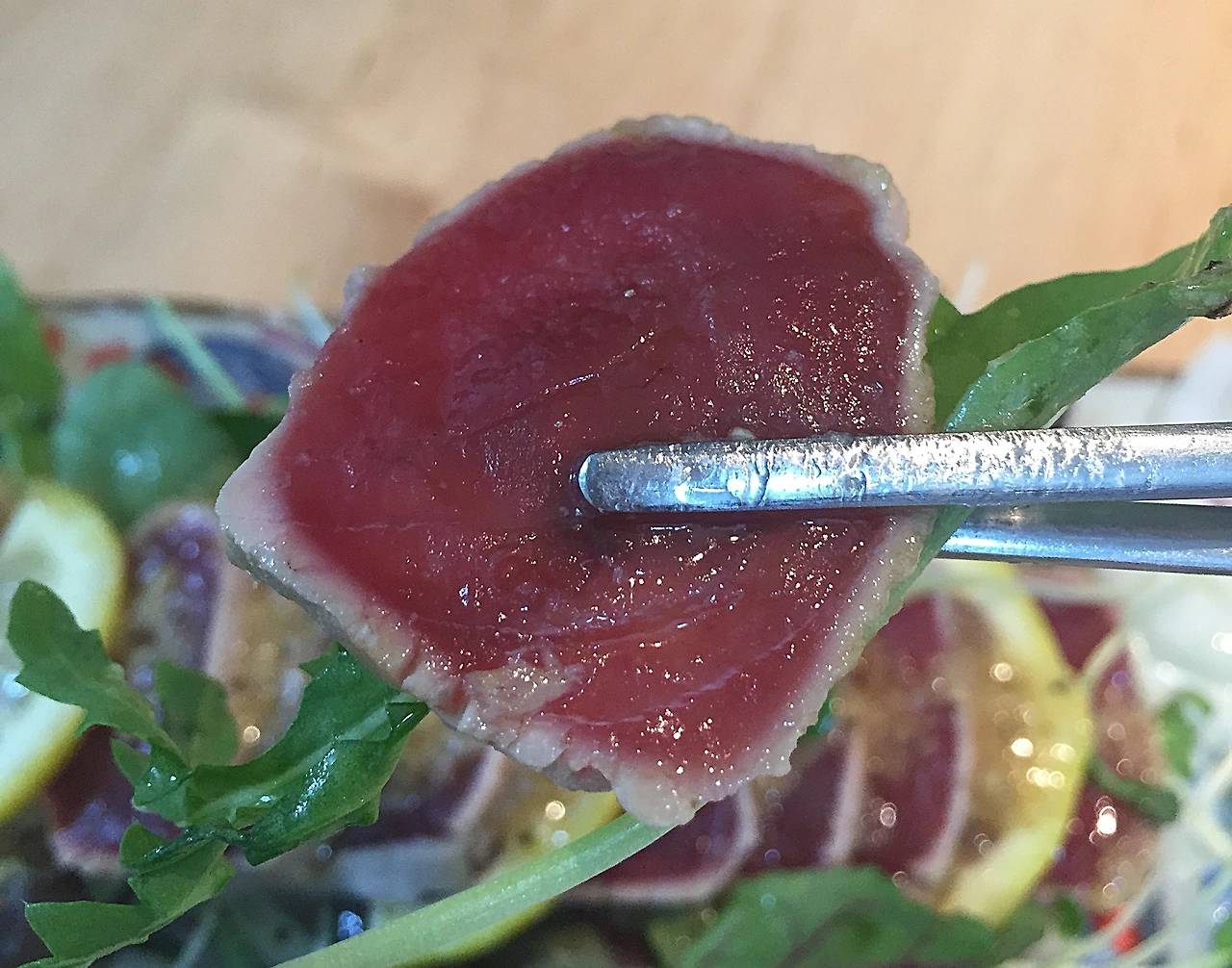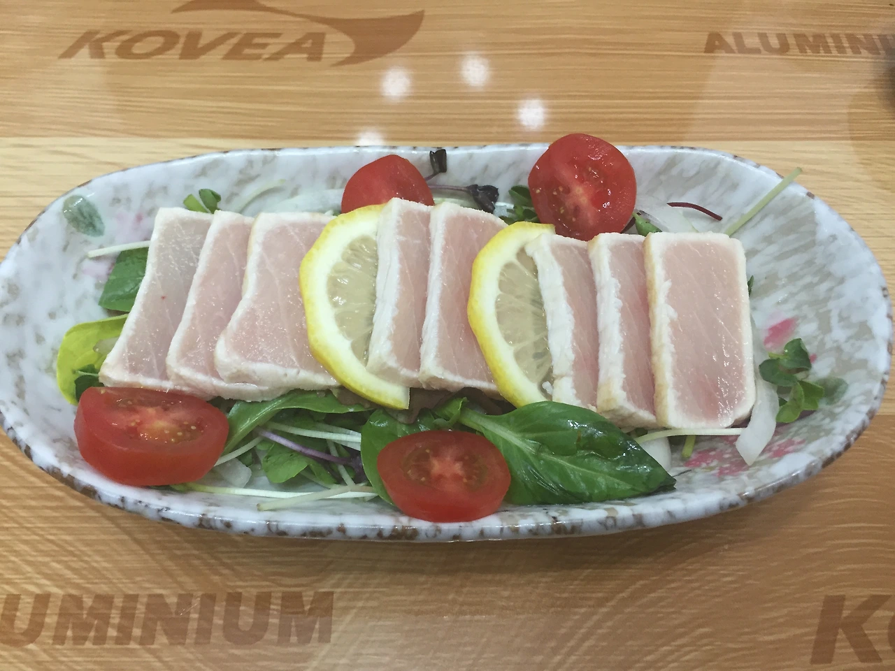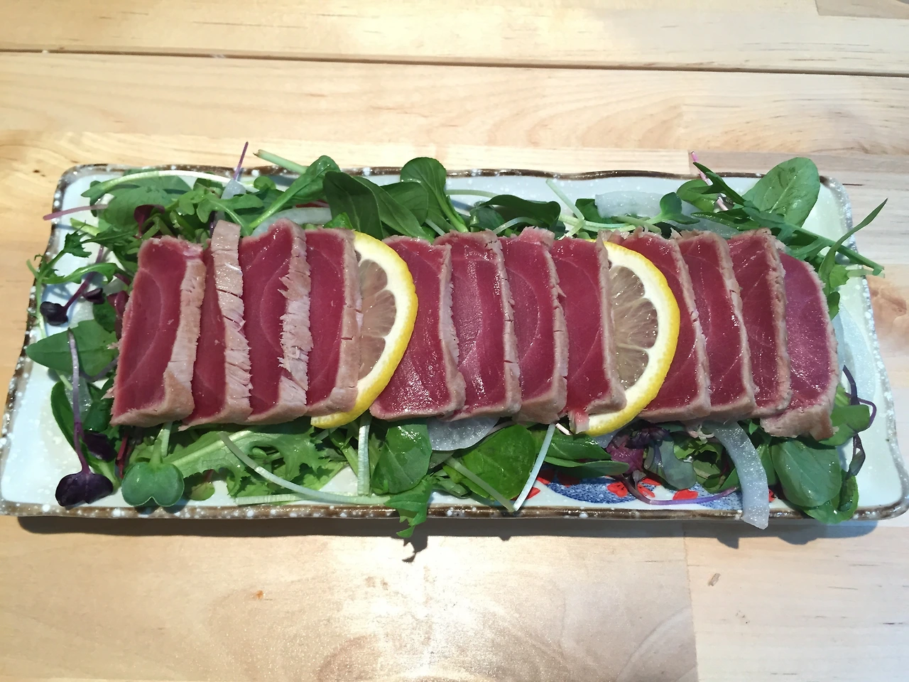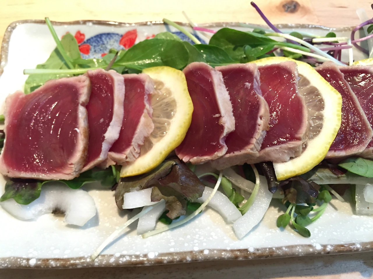 특유의 검붉은 색상이 마치 고급스러운 참치 이미지를 연상시키지만, 가다랑어는 저렴한 참치이다. 타다끼를 하면 가다랑어의 비린내와 잡내가 감춰진다. 거기다가 소스를 뿌려먹으니..