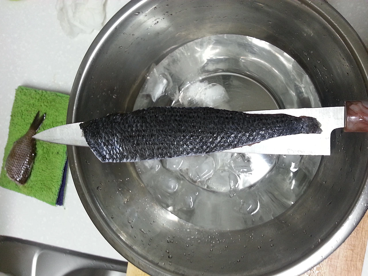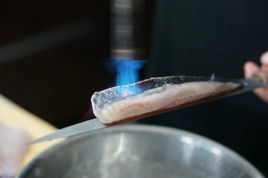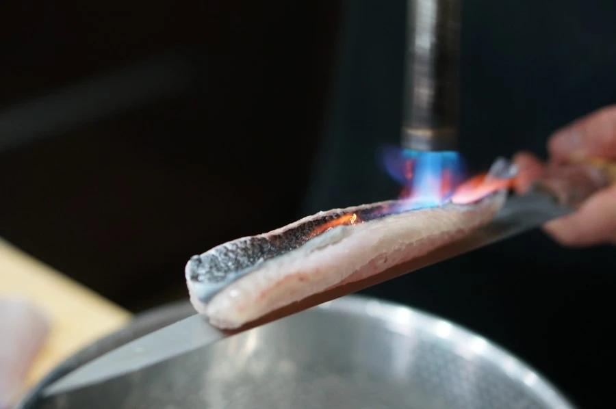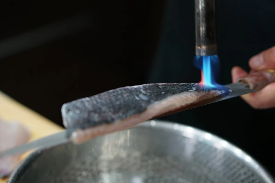 이제 토치로 껍질을 익힐 시간이다. 얼음물을 준비하고, 칼 위에 생선을 올려 놓는다.