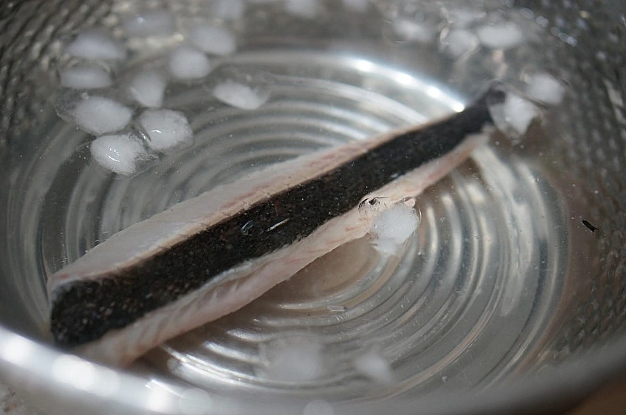 익힌 후에는 바로 얼음물에 담가 주어야 한다. 껍질의 열기에 생선살이 익는 걸 막아준다.