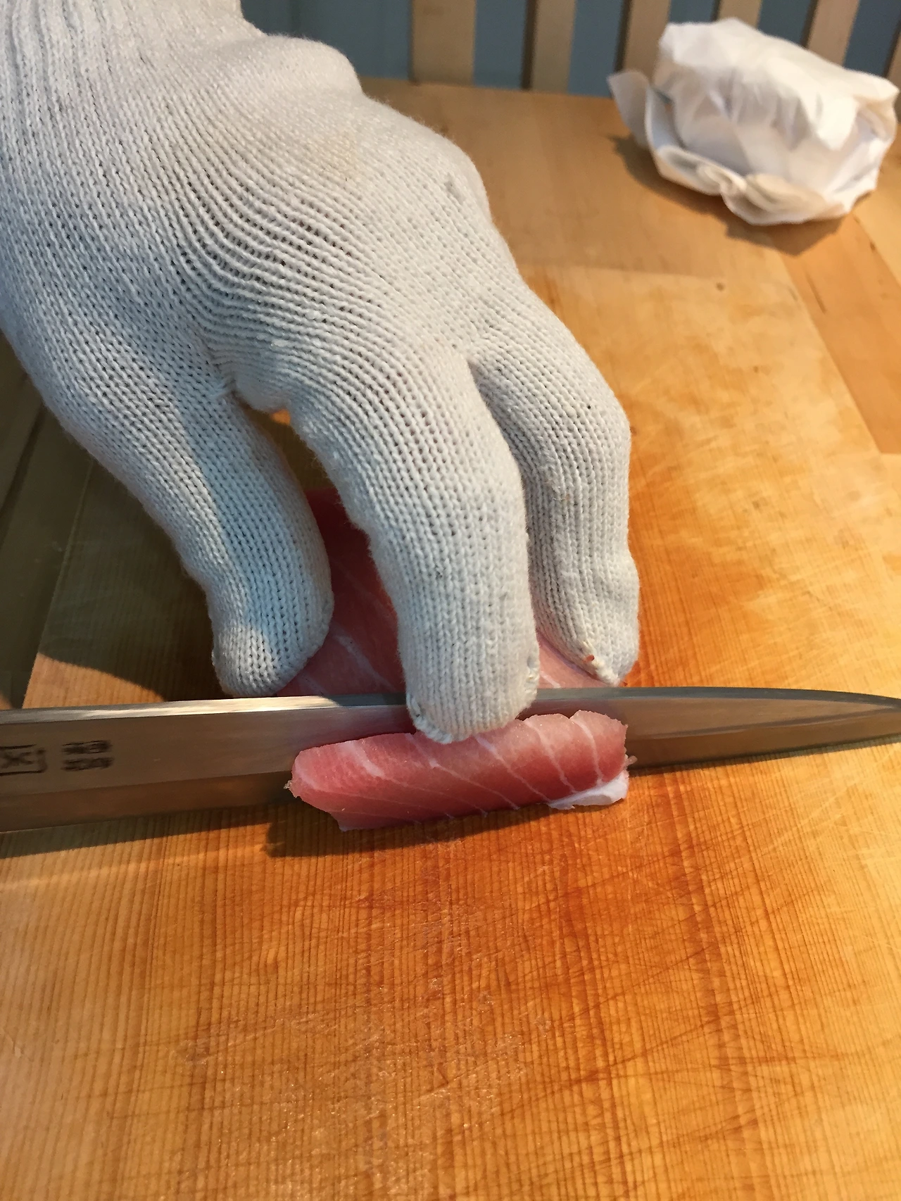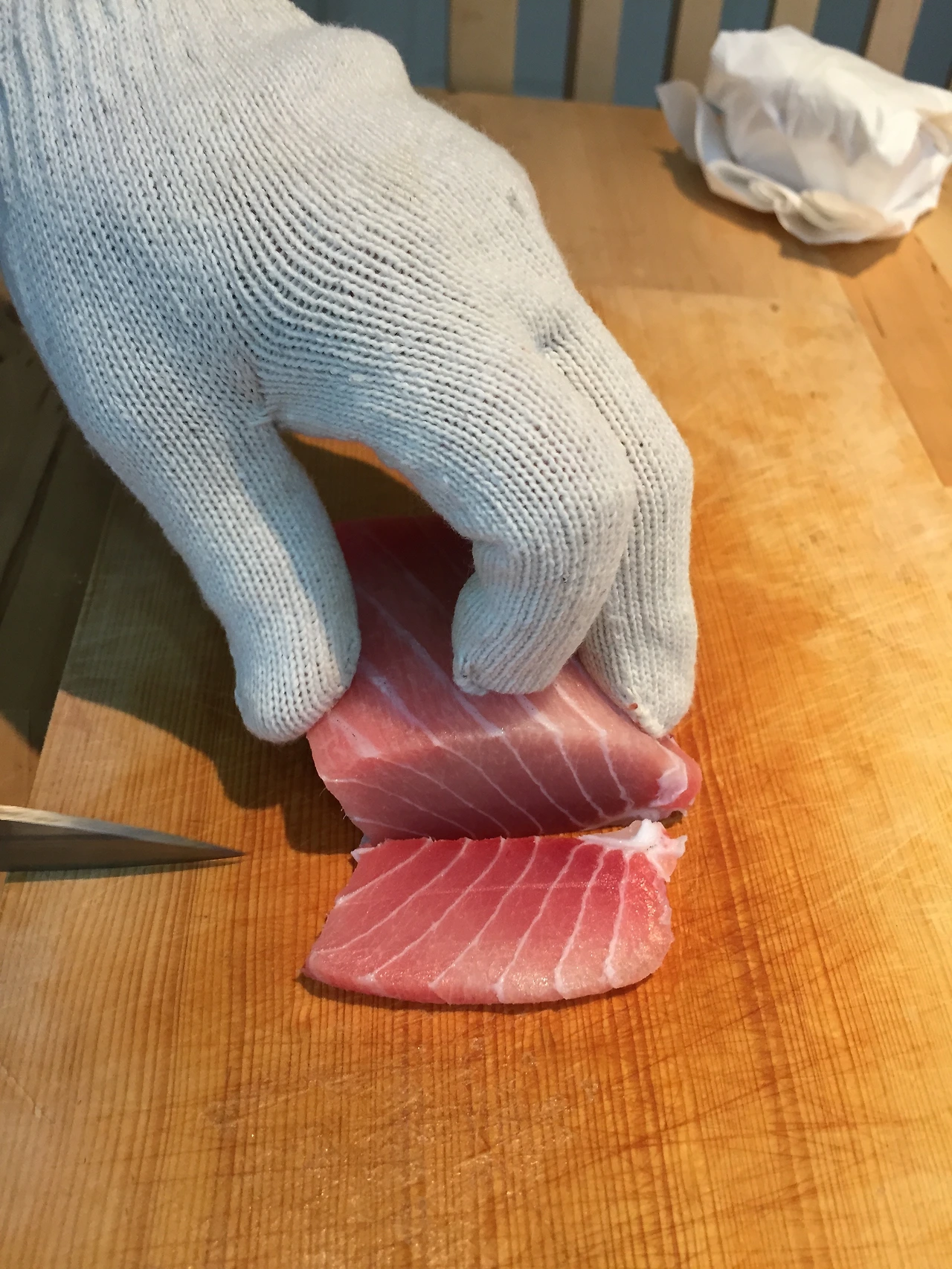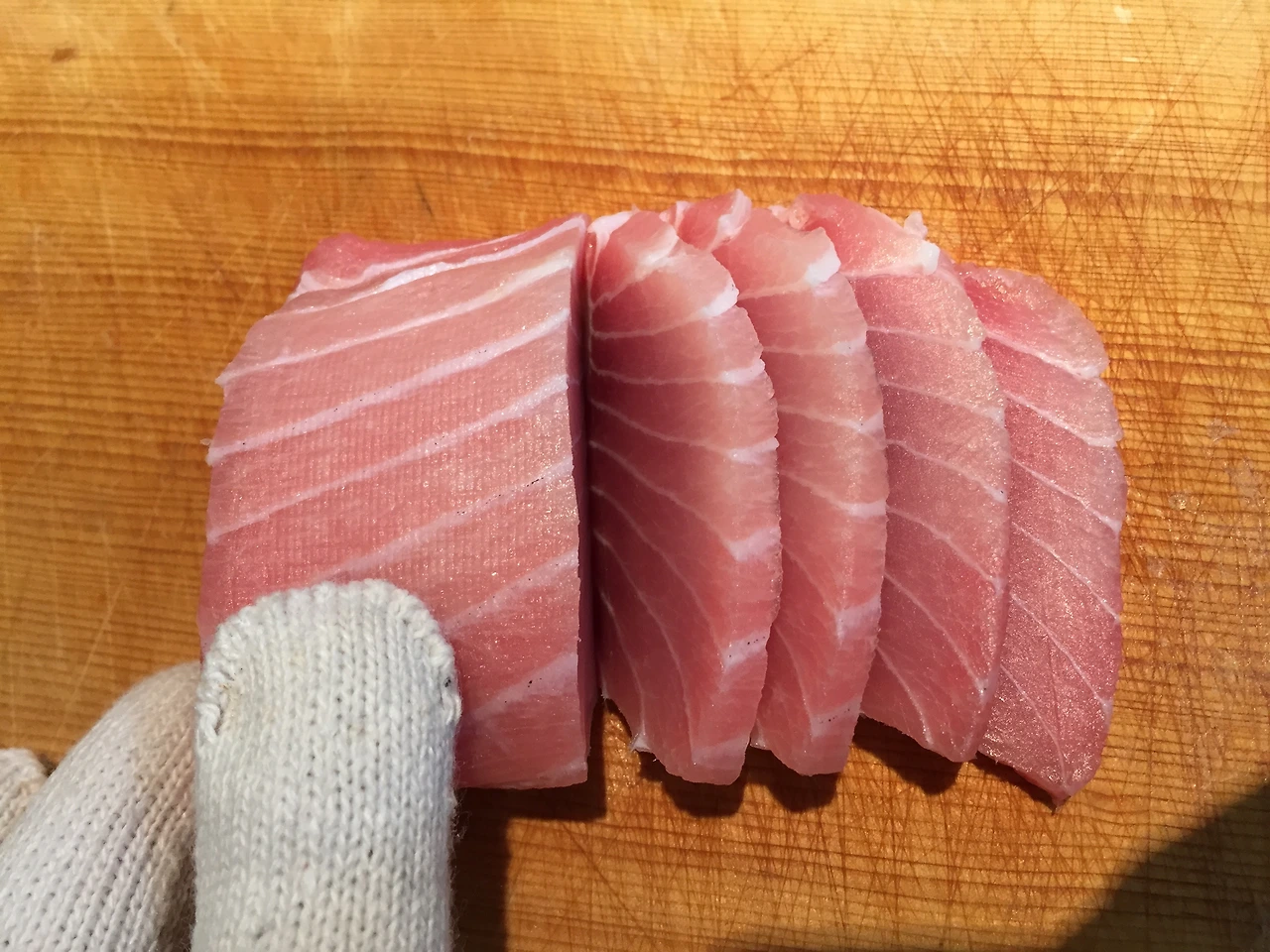 손질 방법은 부위마다 모두 다르다. 이 글에서는 눈다랑어 뱃살(복육)과 눈다랑어 속살(적신, 아카미)를 추천했는데 속살은 손질할 필요 없이 바로 썰어내면 되므로, 눈다랑어 뱃살 손질법을 소개하겠다. 중뱃살 기준이며, 앞뱃살과 뒷뱃살은 약간 다르긴 하지만 유사하므로 마스터 하면 다른 건 더 쉽다.