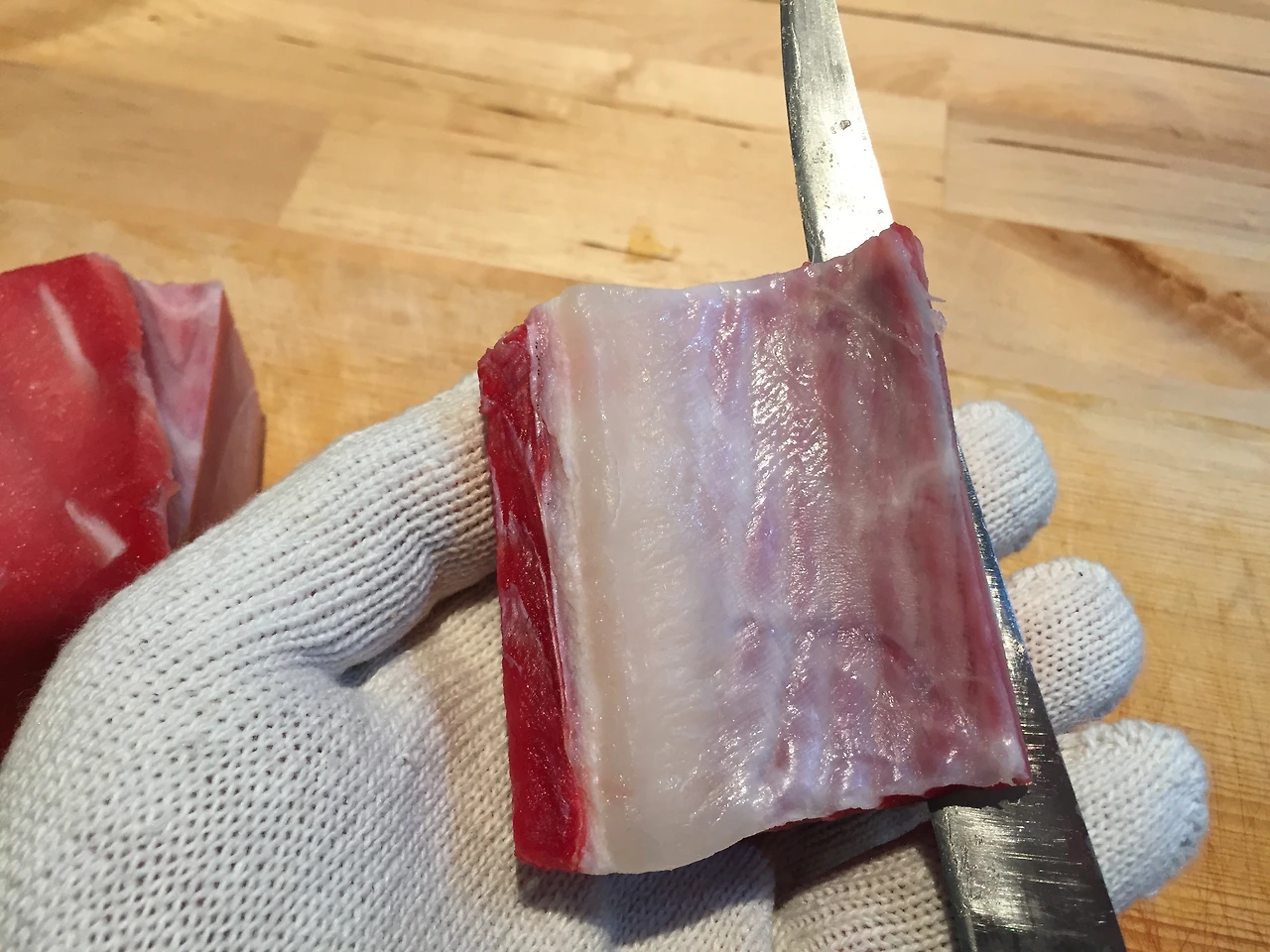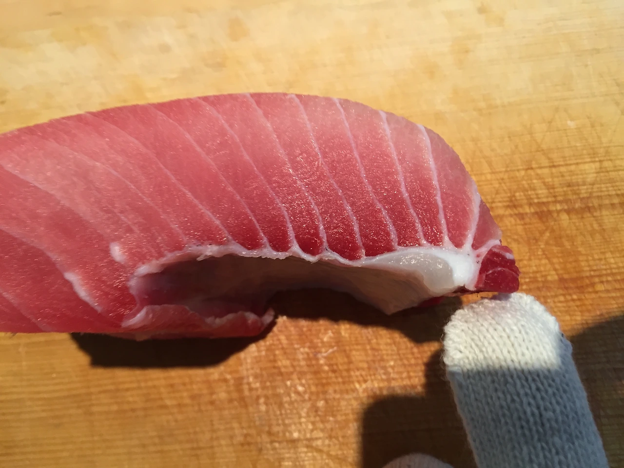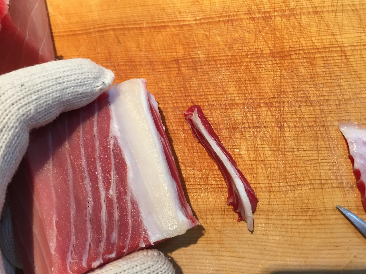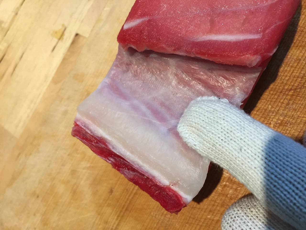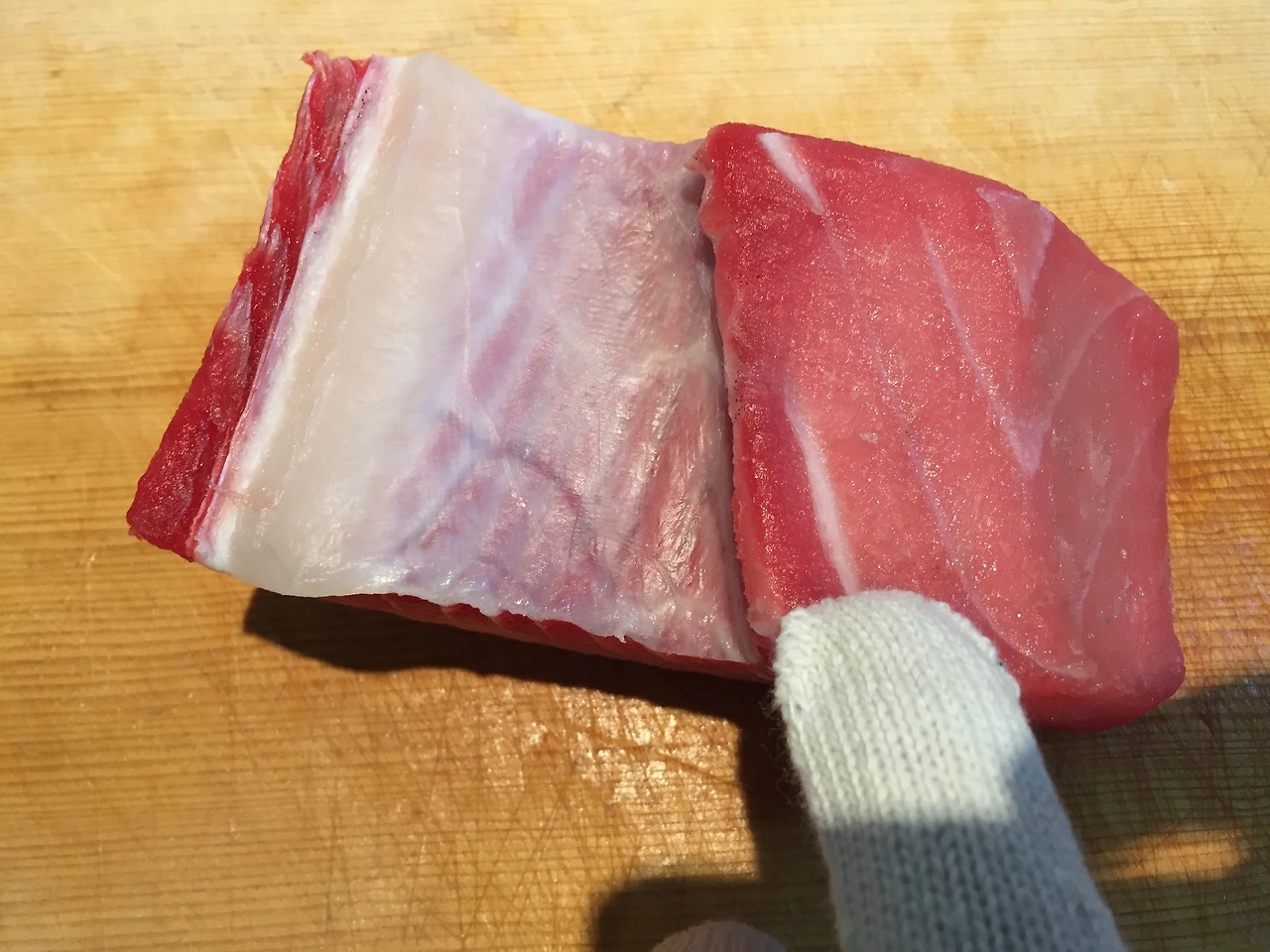 껍질 부분이다. 눈다랑어 복육은 사진처럼 껍질이 제거된 채로 판매되므로 따로 손질할 부분은 없다. 등살이나 일반 뱃살은 껍질이 있으므로 껍질을 제거해 줘야 한다.