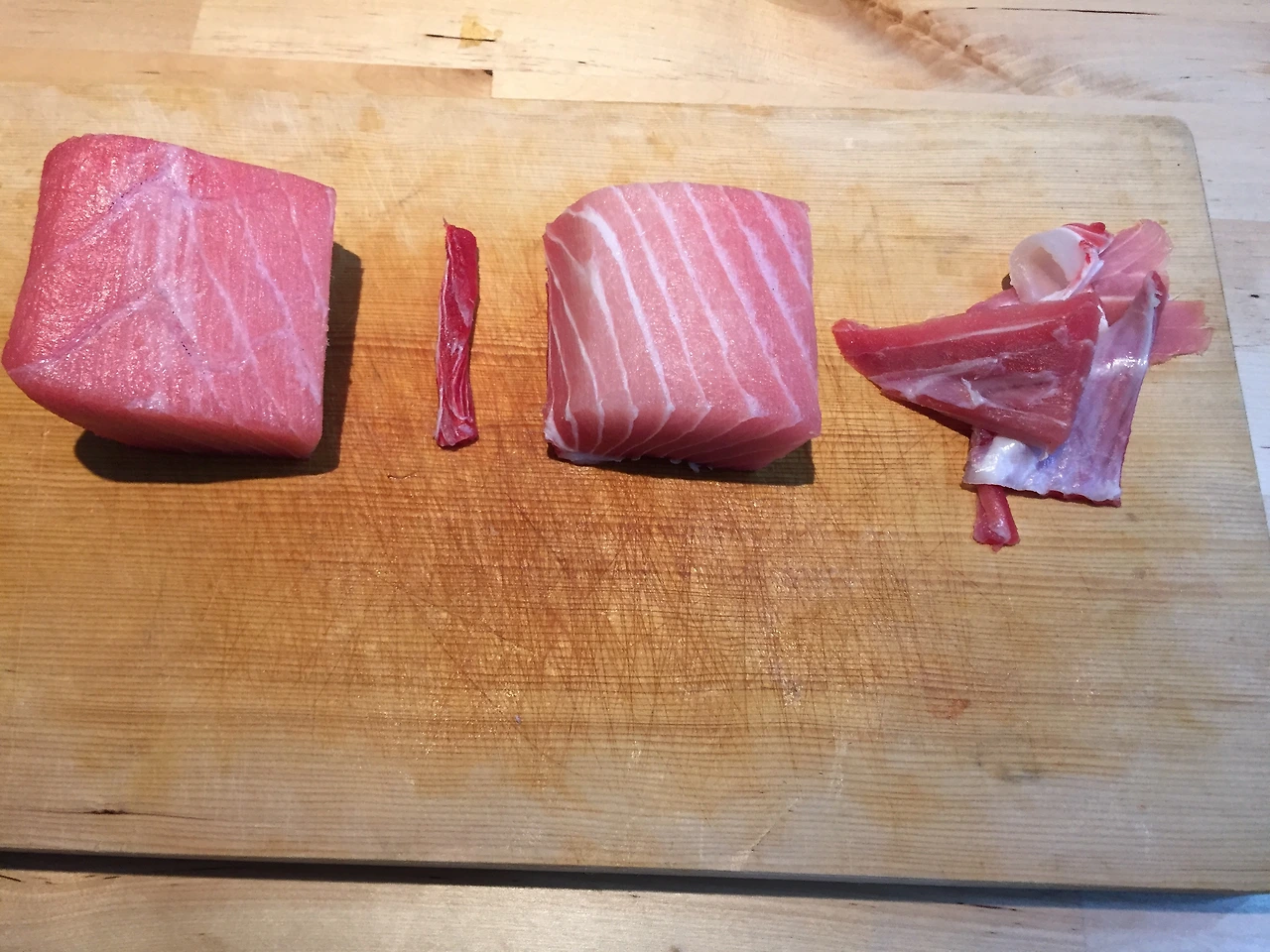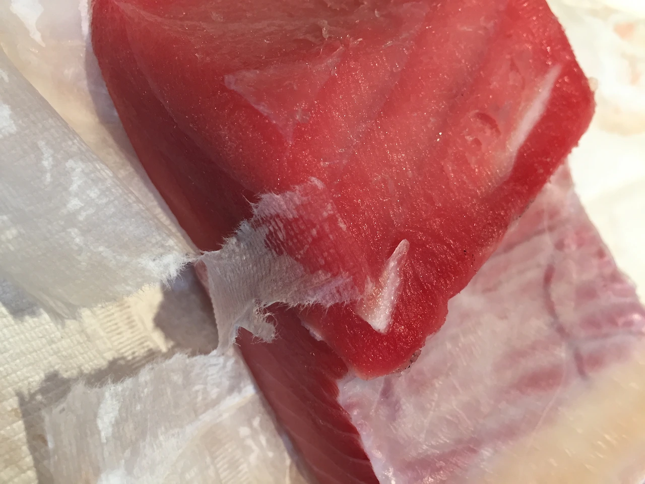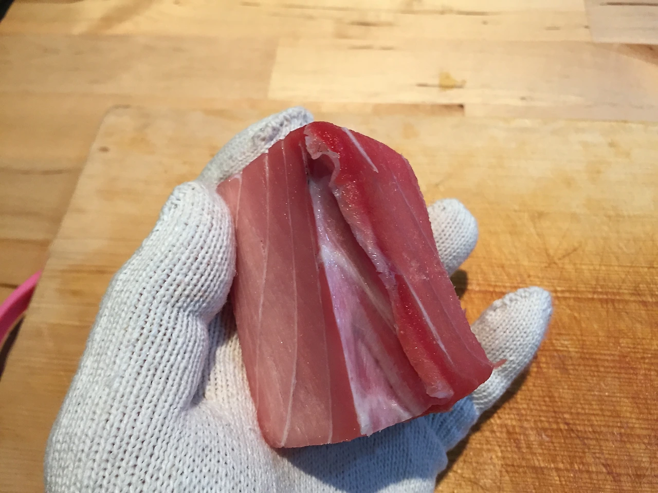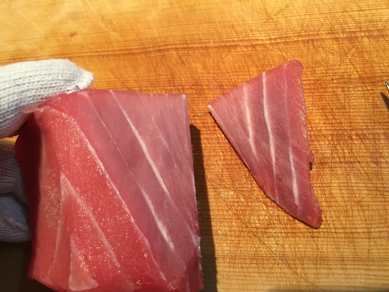 껍질 부분이다. 눈다랑어 복육은 사진처럼 껍질이 제거된 채로 판매되므로 따로 손질할 부분은 없다. 등살이나 일반 뱃살은 껍질이 있으므로 껍질을 제거해 줘야 한다.
