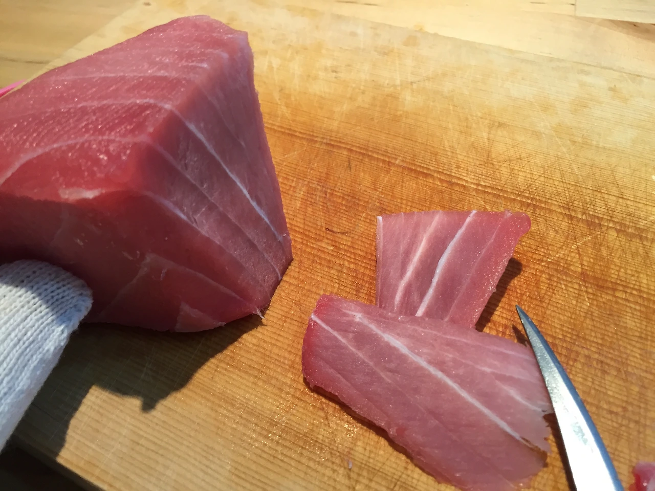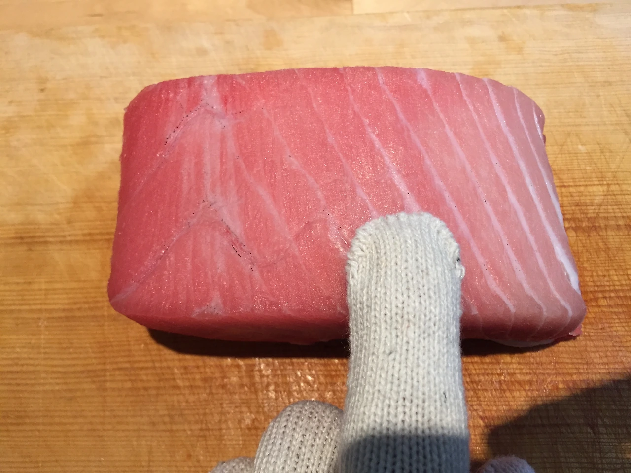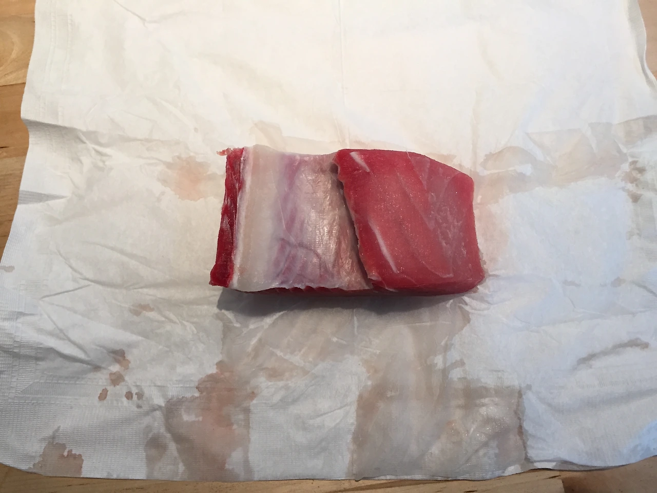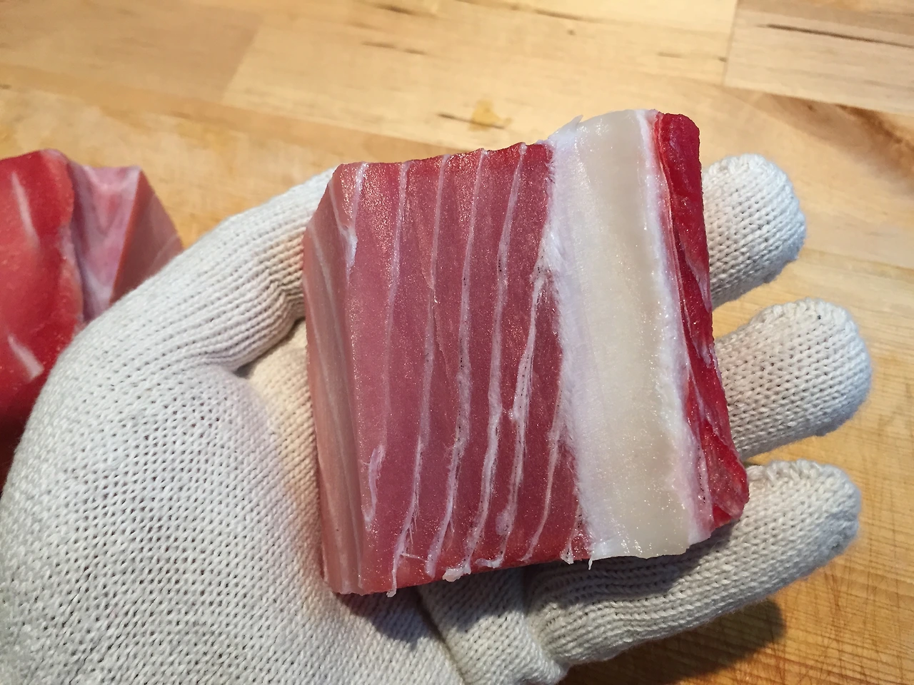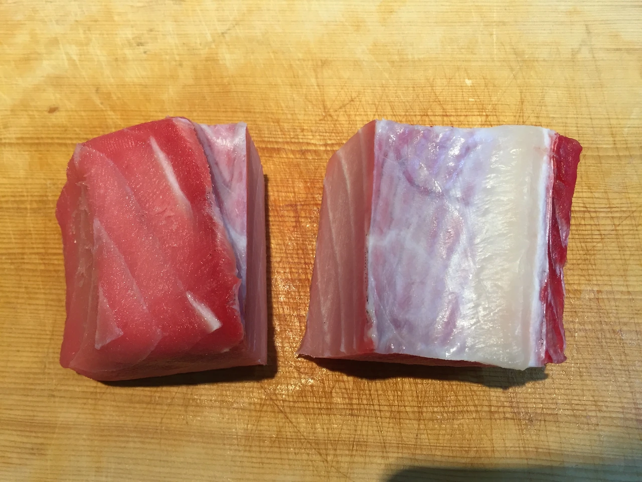 껍질 부분이다. 눈다랑어 복육은 사진처럼 껍질이 제거된 채로 판매되므로 따로 손질할 부분은 없다. 등살이나 일반 뱃살은 껍질이 있으므로 껍질을 제거해 줘야 한다.