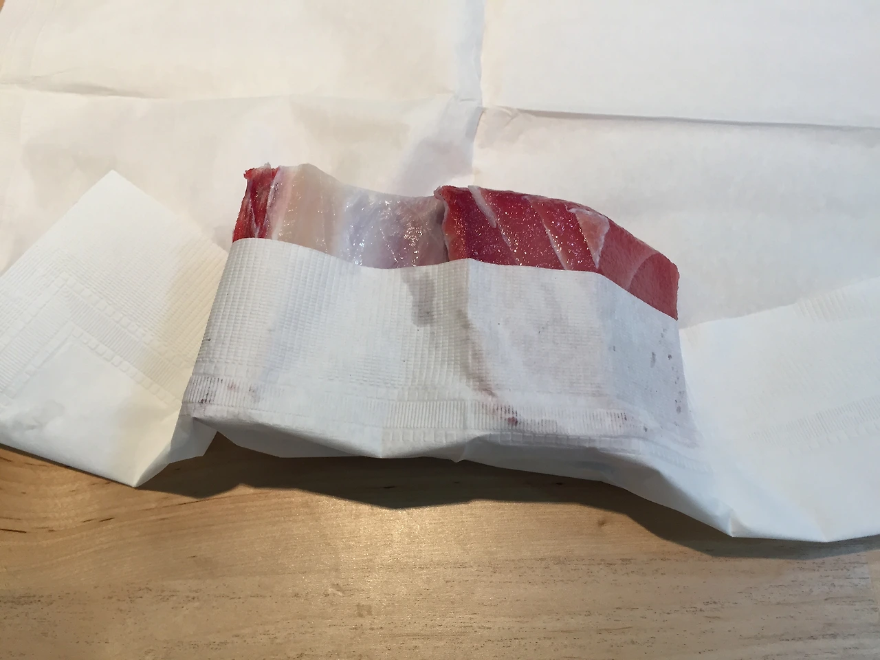 해동지는 질기기 때문에 사진처럼 참치에 붙더라도 떼어낼 수 있지만, 키친타올은 잘 떨어지지 않아서 불편하다. 또한 해동지를 쓰는 주 목적은 수분을 빨아들이는 것인데 키친타올은 흡수력이 좀 떨어진다.