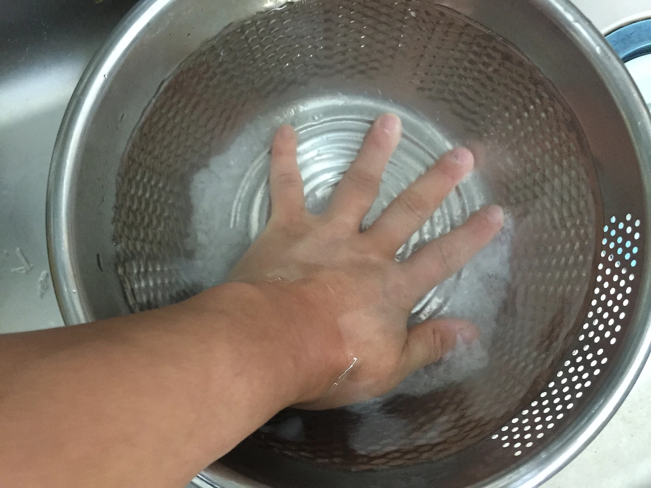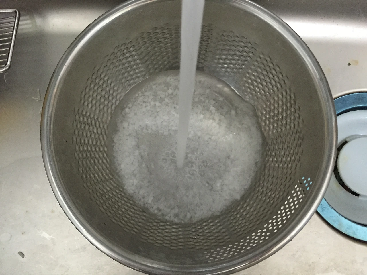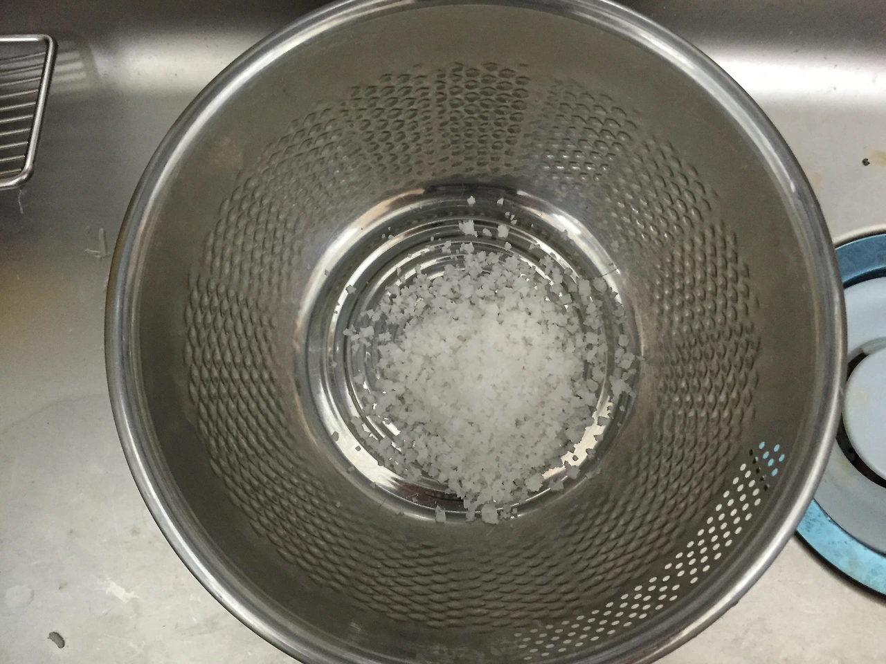 굵은 소금 한주먹 정도에 찬물을 부어 잘 녹여주면 된다. 일부 잘 녹으라고 따뜻한거나 미지근한 물을 넣는 사람이 있는데 영하 50도로 얼어있는 참치에게는 거의 화상 수준이다. 찬물을 사용하도록 하자.