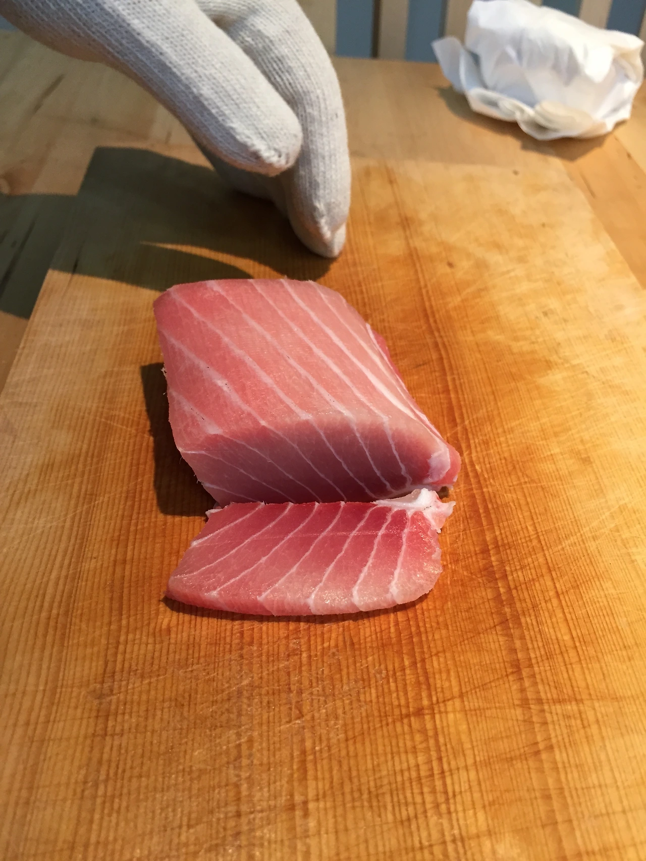 이 참치는 숙성을 6시간 거쳤다. 너무 얼어있지도 않고, 적당한 윤기를 보이는 이 정도 상태일 때가 가장 맛있다.